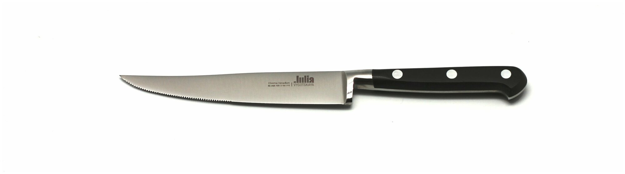 Нож "Julia Vysotskaya" изготовлен из высококачественной нержавеющей стали, удобная эргономичная ручка выполнена из бакелита. С помощью ножа для стейков вы можете получить превосходный результат при нарезке стейков или отделения мяса от кости.