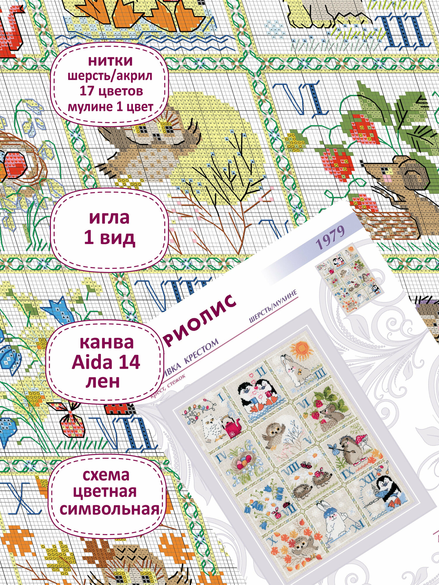 | В набор входит | 14 Aida Zweigart белая, мулине шерсть/акрил + мулине СПб (17 цветов), игла, цветная символьная схема и инструкция |