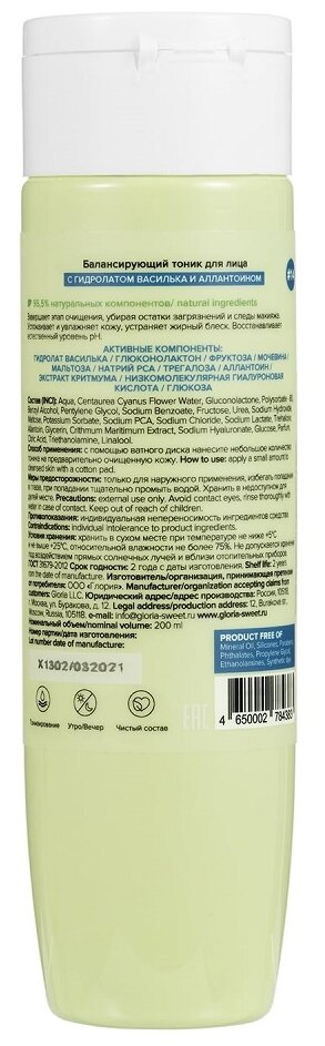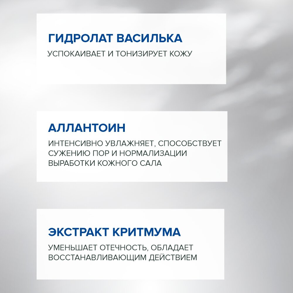 Состав: Aqua, Centaurea Cyanus Flower Water, Gluconolactone, Polysorbate-80, Benzyl Alcohol, Pentylene Glycol, Sodium Benzoate, Fructose, Urea, Sodium Hydroxide, Maltose, Potassium Sorbate, Sodium Pca, Sodium Chloride, Sodium Lactate, Trehalose, Allantoin, Glycerin, Crithmum Maritimum Extract, Sodium Hyaluronate, Glucosе, Parfum, Citric Acid, Triethanolamine, Linalool.