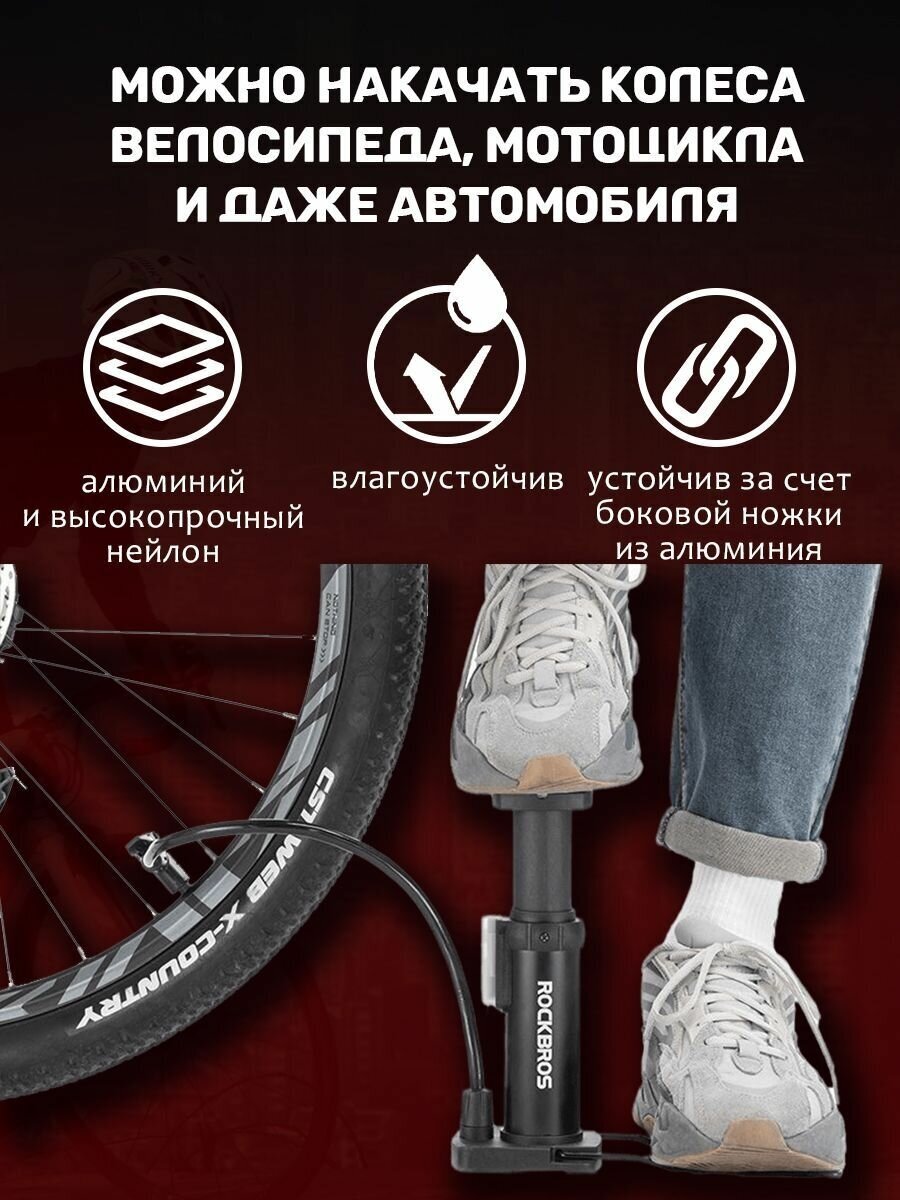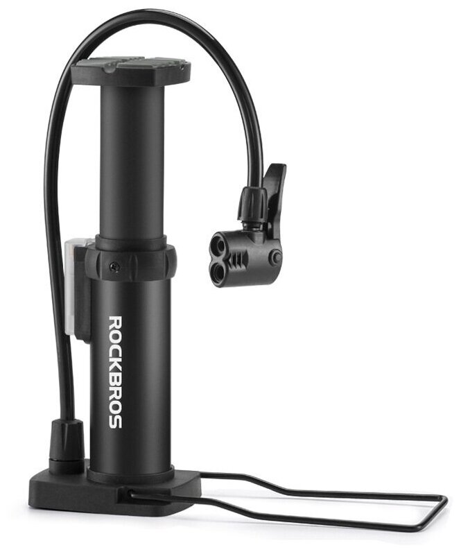RockBros выполнен из алюминия и высокопрочного нейлона. Позволит без труда накачать колеса велосипеда, мотоцикла и даже автомобиля. Выдерживает давление воздуха около 80 Psi, чтобы надуть необходимые предметы как можно быстрее. Регулируемый курок изменяет скорость накачки воздухом. Насос отличается устойчивостью благодаря широкой «ноге» с глубокими протекторами. Дополнительную устойчивость обеспечивает боковая ножка из алюминия, которая легко устанавливается и поднимается вверх, при необходимости. Насос устойчив к попаданию влаги. Он имеет небольшие размеры и малый вес. Его удобно носить с собой или брать в поездку. В набор входит несколько переходников для всех видов колес и надувных изделий.