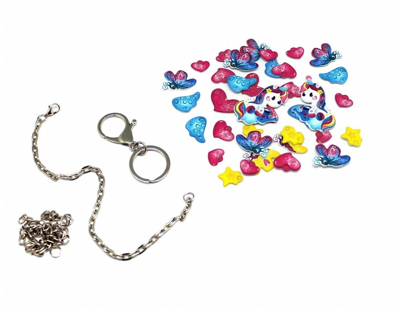 | Состав набора | 2 листа со стикерами, цепочка для браслета, брелок, короткие цепочки, крепежные колечки, инструкция |