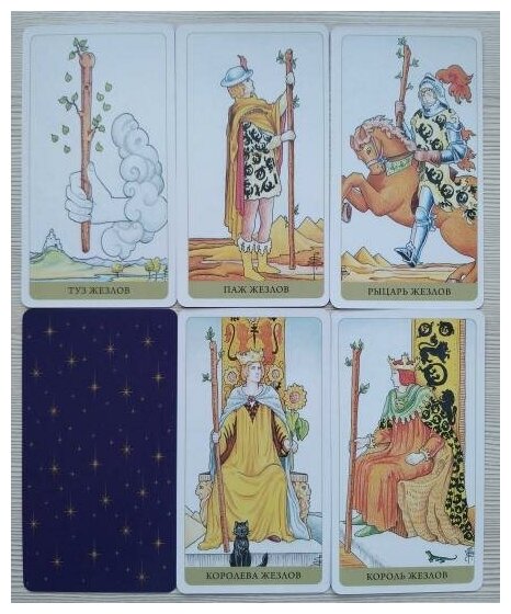 Отличное соотношение цена/качество! А картон даже получше, чем в последних авваллоновских колодах - Таро Грегори Скотта, Таро В Конце Радуги. Неплохая МБК с четырьмя раскладами и их интерпретациями! Рисовка схожа с Таро Радиант, только бледнее. Но мне эта бледность, а-ля выгоревшие на солнышке карты понравилась. На примере карты Колесо Фортуны, я показываю эффект штриховки цветным карандашом. Эти карты будто раскрашены цветными карандашами - очень мило и нежно! Иногда не хватает чуть насыщенного фона, но это мелочи. Красивая рубашка в виде звeздного неба. И ещё один приятный нюанс - здесь более эмоциональные и ярко выраженные лица у персонажей, в отличие от классической колоды написанной Памелой Колман Смит. Эти лица прописала художница Мэри Хэнсон-Робертс. Для примера я сфотала лица Верховной Жрицы и Короля Кубков. Король сидит на такой измене!