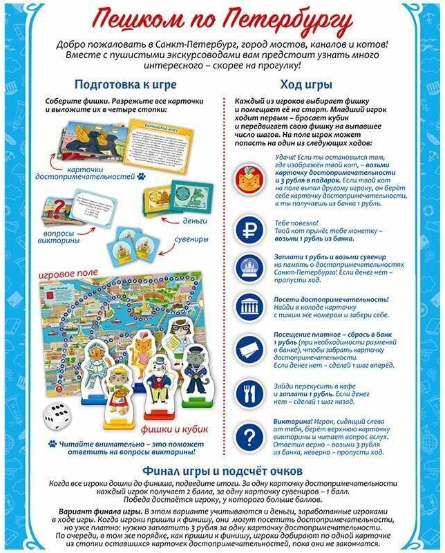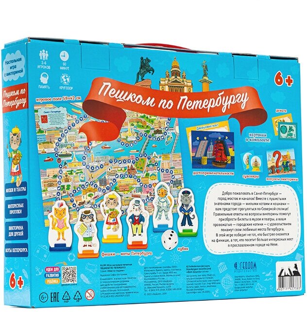 | Комплектация | игровое поле, карточки достопримечательностей, карточки сувениров, карточки с вопросами викторины, игровая валюта, 6 фишек, игровой кубик, правила игры |