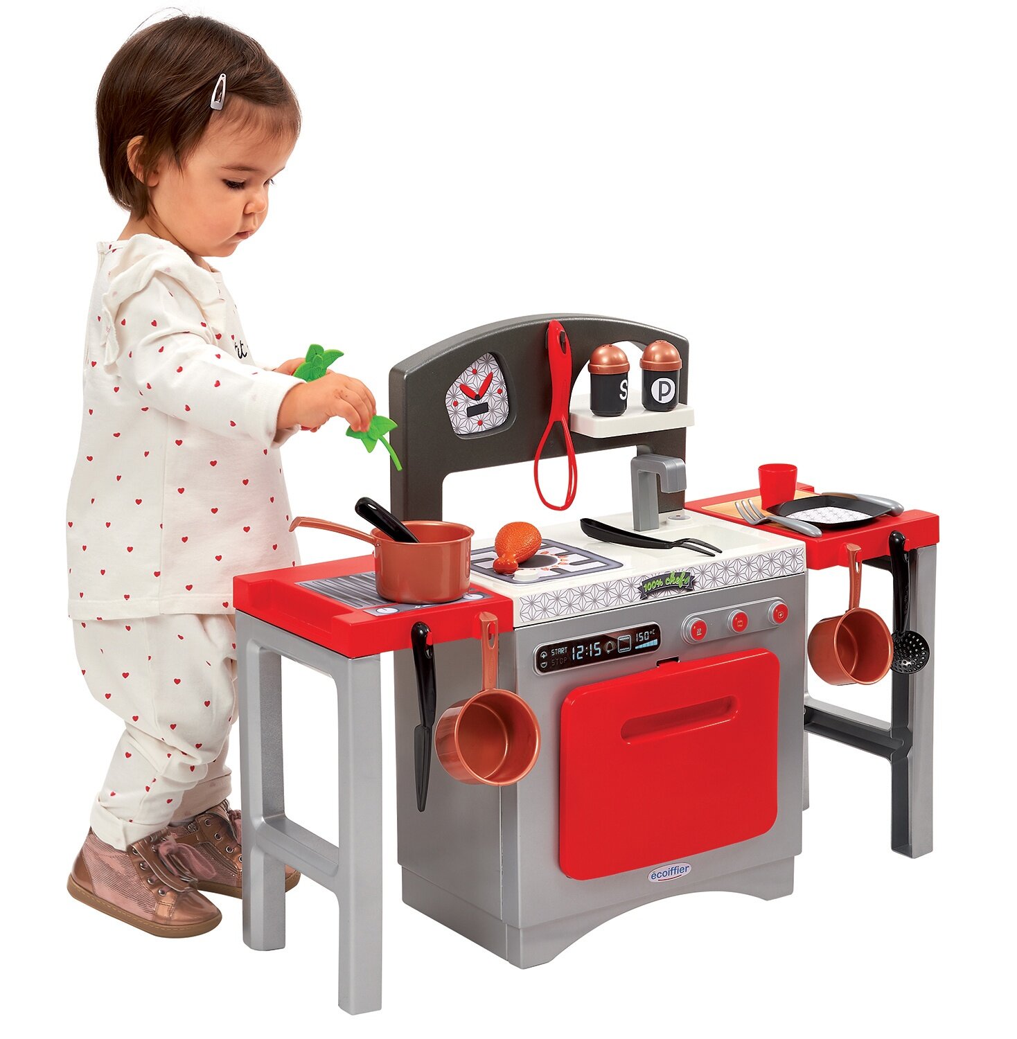 На игровой кухне есть все необходимое: духовка, плита, раковина с краном, множество полок для хранения, а также посуду, столовые приборы и многое другое. Обширные аксессуары в стильном латунном дизайне включают три ковшика, соль и перец, а также различные кухонные инструменты, посуду, столовые приборы и многое другое. Все товары Ecoiffier производятся во Франции.