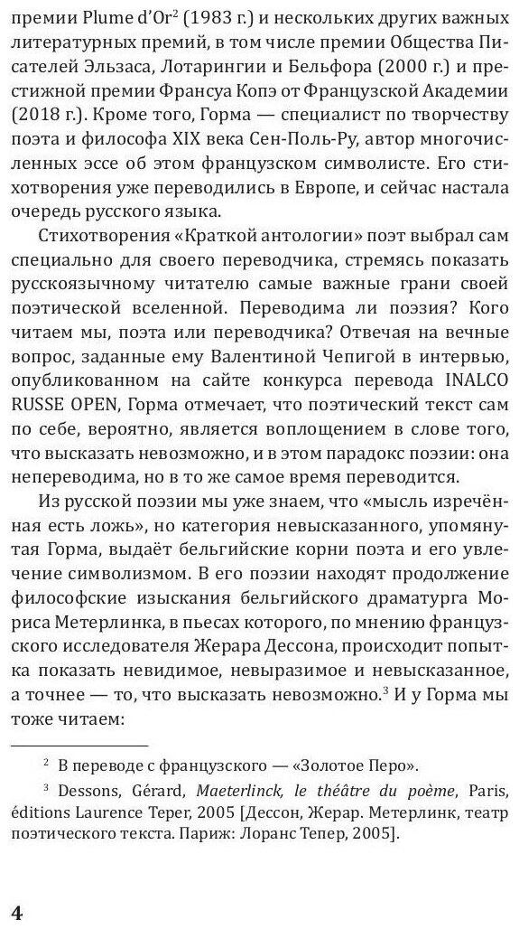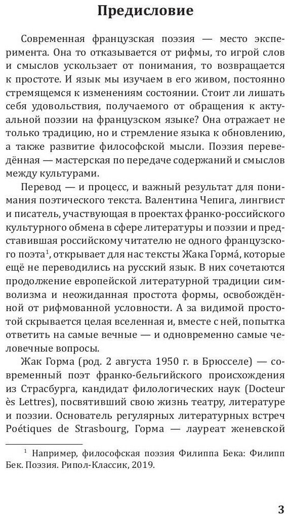 Жак Горма — современный франкоязычный поэт, лауреат женевской премии Plume d’Or (1983), премий Общества Писателей Эльзаса, Лотарингии и Бельфора (2000) и Франсуа Копэ Французской Академии (2018). Стихотворения для этого сборника поэт выбрал сам, стремясь показать русскоязычному читателю самые важные грани своей поэтической вселенной. В его поэзии находят продолжение философские изыскания бельгийского драматурга Мориса Метерлинка, происходит попытка показать невидимое, невыразимое и невысказанное. Поэтический текст становится лабораторией поэтического творчества, источником знания о жизни, о природе и о человеке.