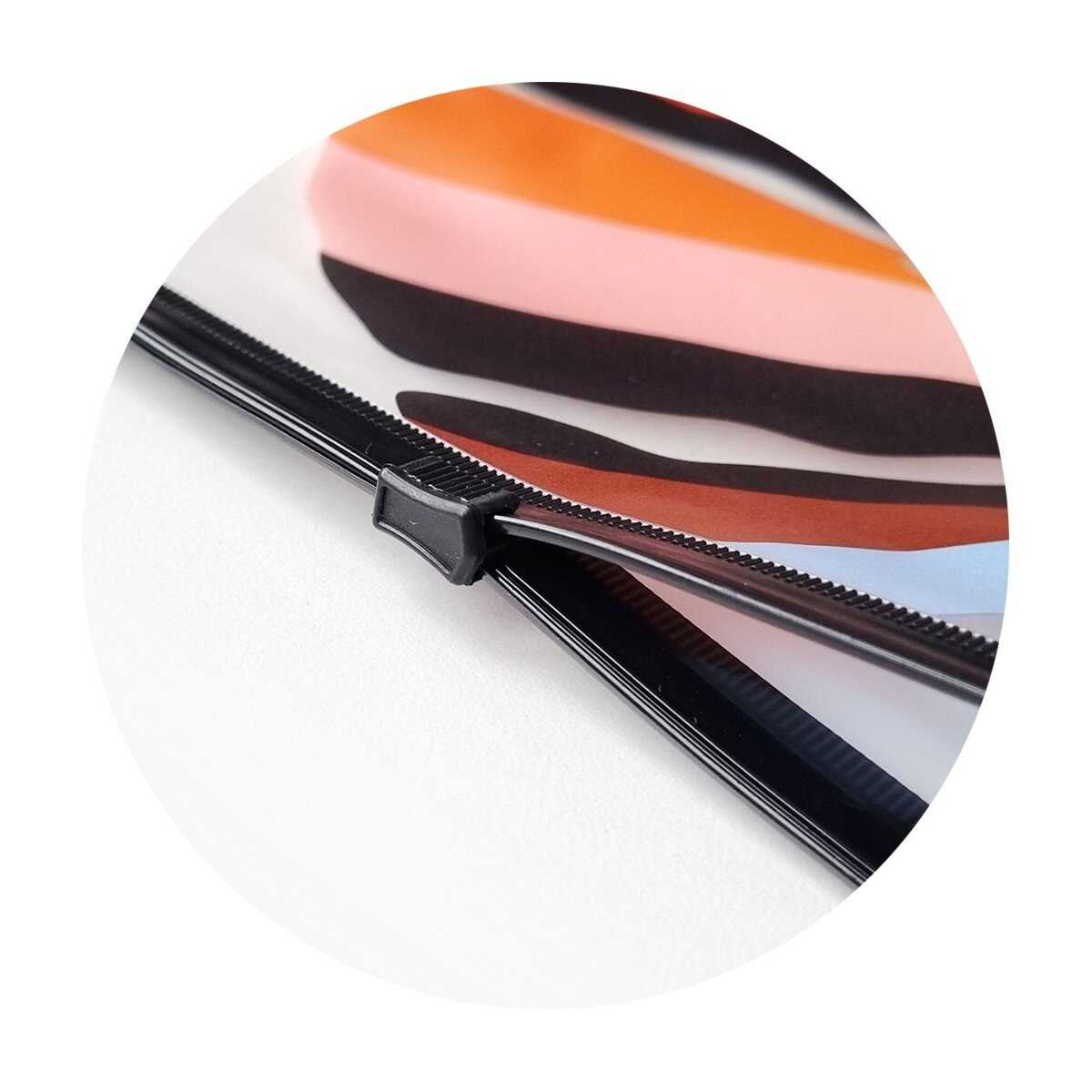 Папка изготовлена из плотного прозрачного пластика толщиной 150 мкм с цветной печатью и надежной пластиковой застежкой-молнией.