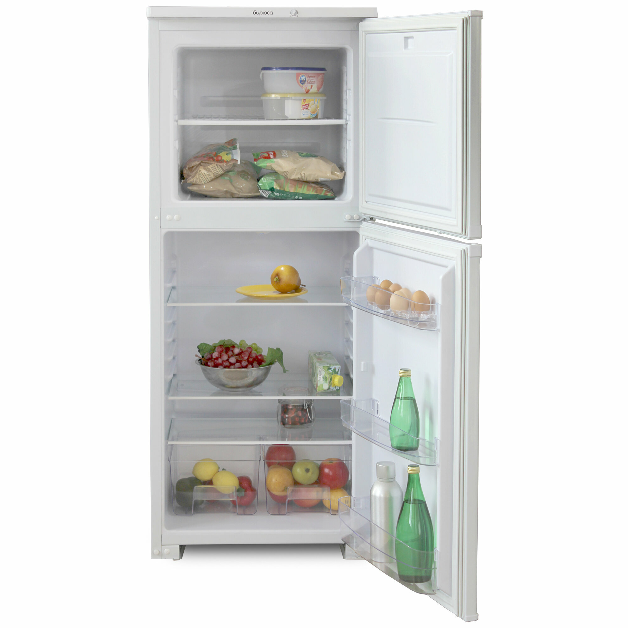 Холодильник Бирюса имеет две камеры, каждая из которых оснащена отдельной дверцей, что способствует сохранению холода при открывании одного из отсеков. Холодильная камера на 160 л имеет три полки и два контейнера для овощей и фруктов. Дверные лотки предназначены для хранения бутылок и вертикальных пакетов с напитками, имеется лоток для яиц. Автоматическая система размораживания значительно упрощает быт, исключая необходимость ручной разморозки.