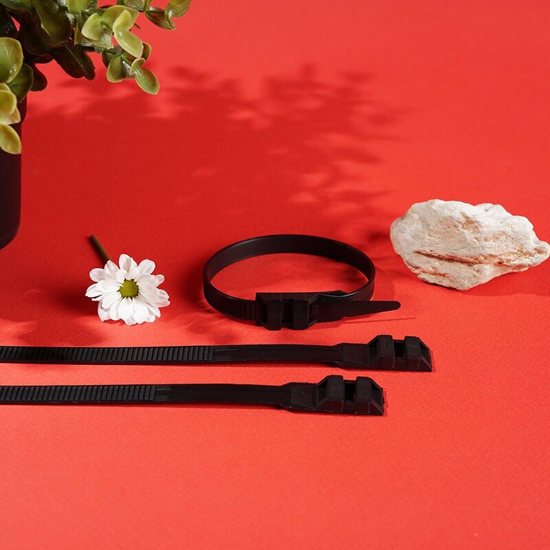 Хомут предназначен в первую очередь для крепежа и бандажирования кабелей и СИП. Отличаются от стандартных стяжек материалом — изготавливаются из нейлона-12, за счет чего имеют большую прочность, стойкость к воздействию агрессивных сред и негативных погодных условий. Также имеют двойной плоский замок, который более компактен в смонтированном виде по сравнению со стандартными стяжками. Такая особенность позволяет экономить пространство при жгутировании и прокладке нескольких пучков кабеля рядом или в одной трассе, например в авиационной промышленности.