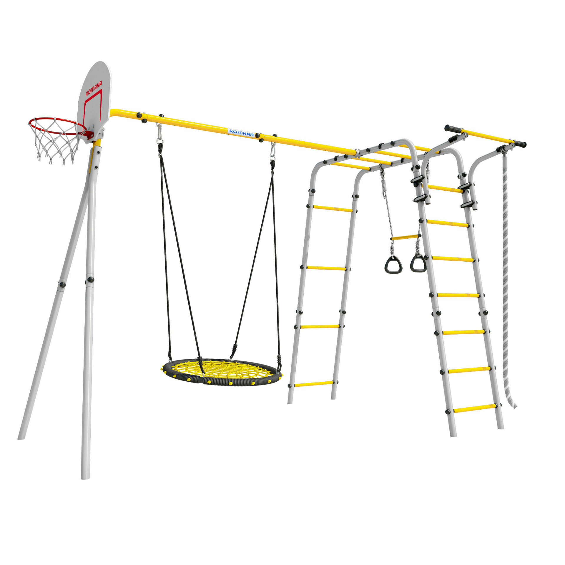 | Комплектация | турник подвижный, качели пластиковые 2 шт, рукоход, баскетбольное кольцо, канат, кольца с перекладиной |