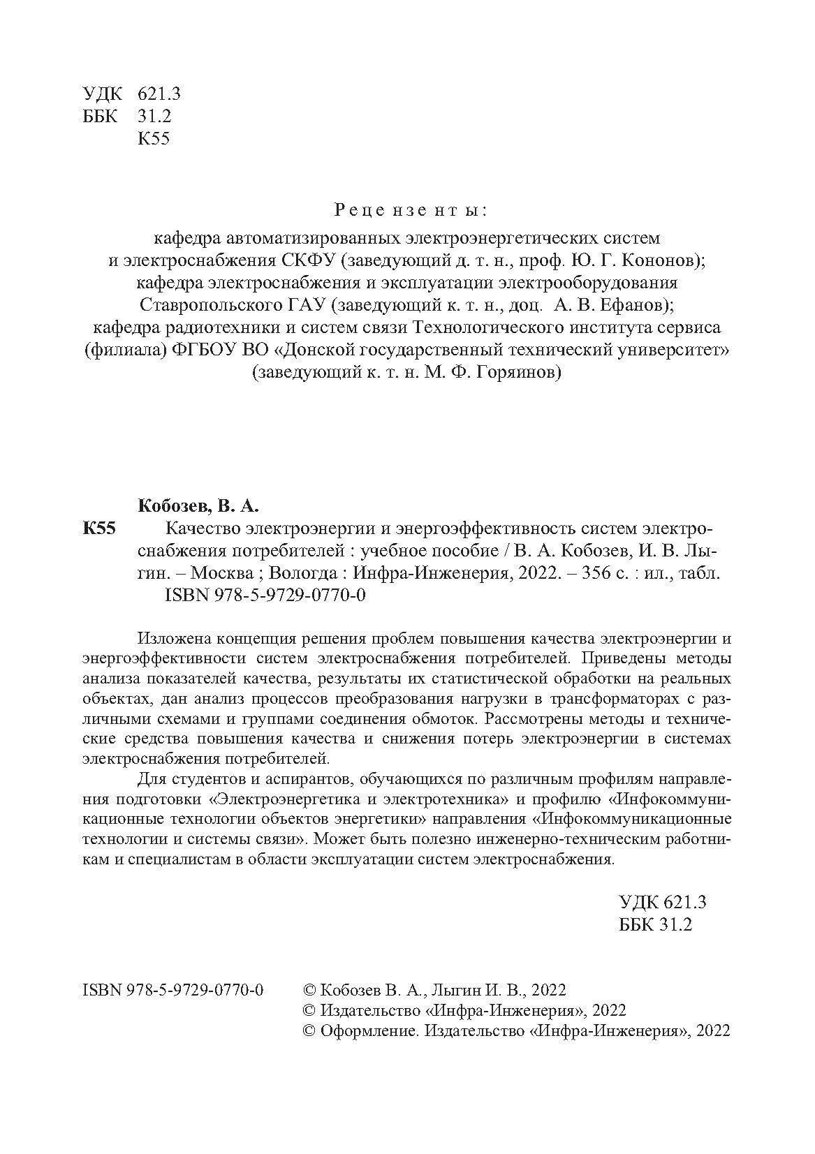 Качество электроэнергии и энергоэффективность систем электроснабжения потребителей (Кобозев Владимир Анатольевич, Лыгиин Иван Викторович); Инфра-Инженерия, 2022
