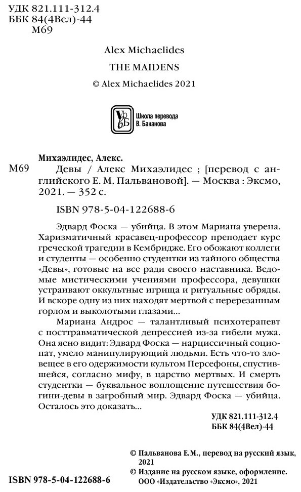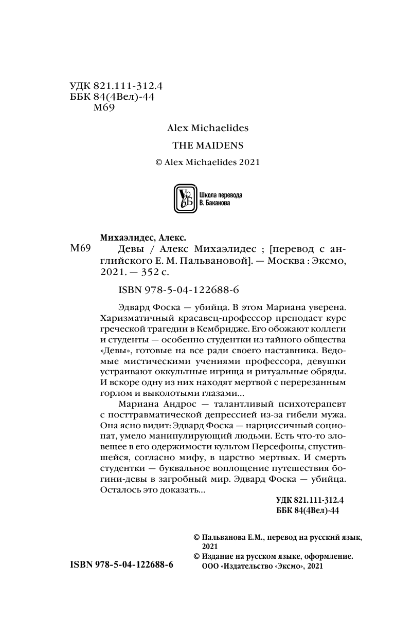 Книга: Девы (Алекс Михаэлидес); Эксмо, Редакция 1, 2024