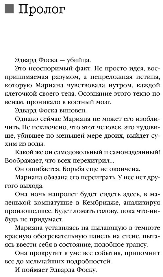 Мариана Андрос - талантливый психотерапевт с посттравматической депрессией из-за гибели мужа. Она ясно видит: Эдвард Фоска - нарциссичный социопат, умело манипулирующий людьми. Есть что-то зловещее в его одержимости культом Персефоны*, спустившейся, согласно мифу, в царство мертвых. И смерть студентки - буквальное воплощение путешествия богини-девы в загробный мир. Эдвард Фоска - убийца. Осталось это доказать…