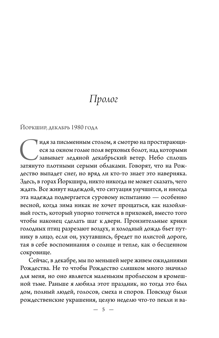Йоркшир, 1996 год. Барбара и Ральф, семейная пара успешных адвокатов из Германии, избрали диковинный способ спасения своего брака: провести Рождество и Новый год на старой ферме в английской глуши. Но там они стали заложниками снежного коллапса - без связи, электричества и почти без еды. В поисках выхода из положения Барбара случайно натыкается на тайник с рукописью - автобиографией бывшей хозяйки этих мест, Фрэнсис Грей. Спасаясь от холода и голода, гостья жадно поглощает историю жизни, где слились воедино столь не похожие друг на друга виды любви, зависимости и ненависти. И пока не думает о том, как тайны давно умершей свидетельницы века могут сказаться на ней самой…