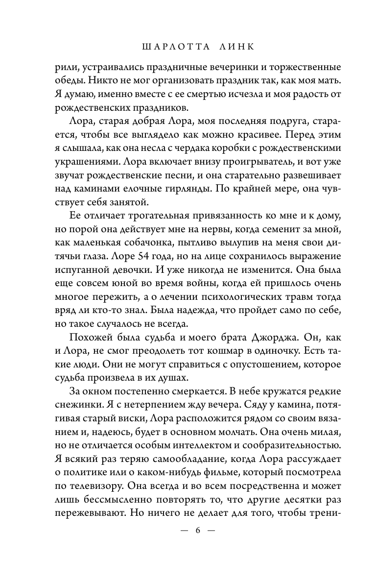 Это моя первая книга Шарлотты Линк и после прочтения захотелось купить еще что-то из ее произведений. Само произведение захватывает с первых страниц. Переплетения судеб и разных характеров одного семейства, которое периодически прерывается на историю жизни современной пары. Суровая реальность борьбы за независимость женщин в XX веке, ужасы первой и второй мировой войны- все это меняет характер молодых героев Прочитала буквально за пару вечером, т.к. было невозможно оторваться. Отличная книга, где в спокойную истории жизни одной семьи красиво и легко вплетена детективная история с непредсказуемым финалом. Слог очень легкий, перевод отличный.