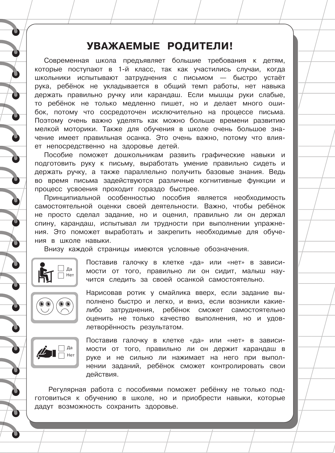 Цель пособия, соответствующего ФГОС — помочь дошкольнику выучить английские буквы и научиться их писать, а также запомнить с помощью рисунков первые английские слова. Выполняя интересные игровые задания, ребёнок будет искать изучаемую букву среди других и обводить её по контуру; попробует написать буквы в строчках самостоятельно; собрать слово из предлагаемых букв. Кроме того, внизу каждой страницы имеются значки для оценки выполненных заданий. Поставив галочку в клетках «да» или «нет», малыш сможет проконтролировать себя, а нарисовав ротик у смайлика вверх или вниз — оценить результат (хорошо / не очень хорошо). Регулярная работа с пособием поможет ребёнку развить мелкую моторику.