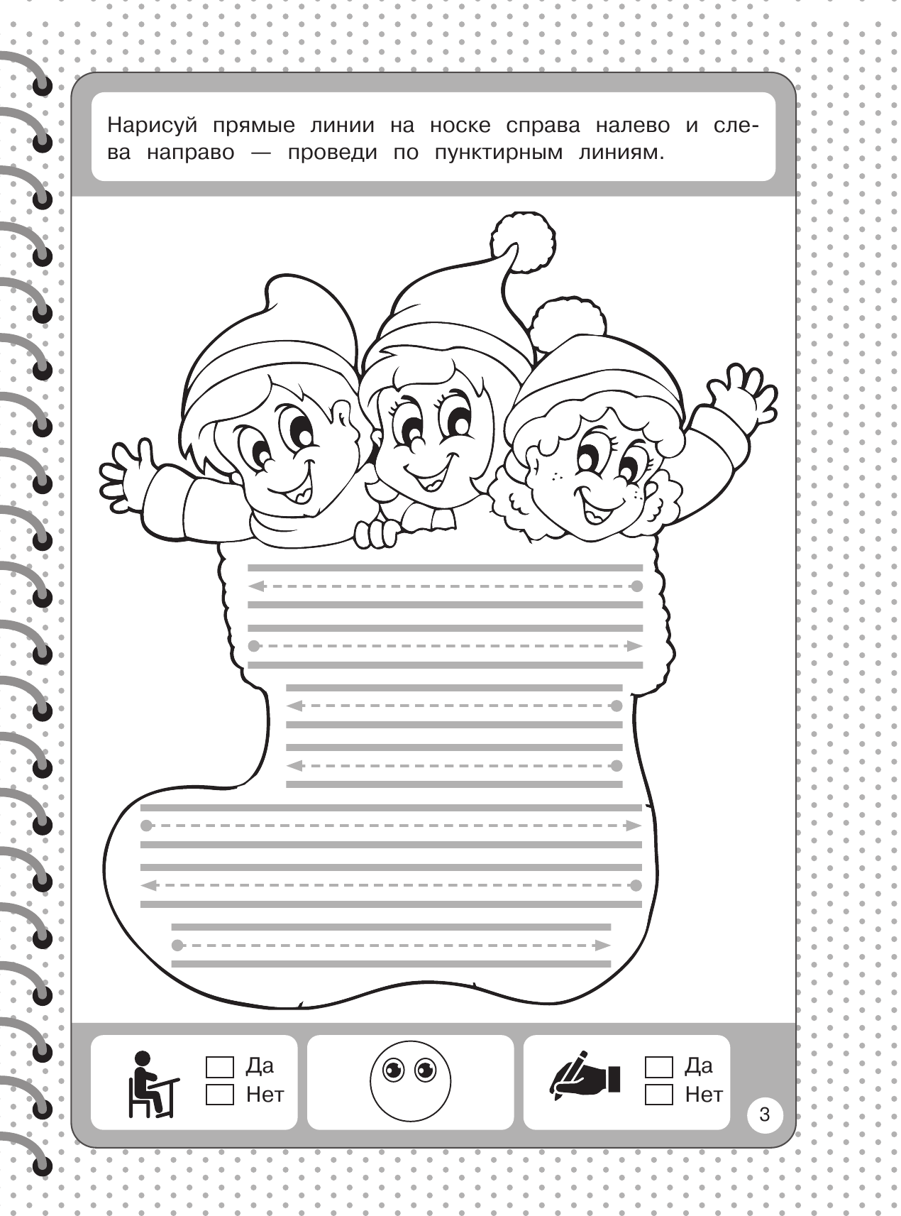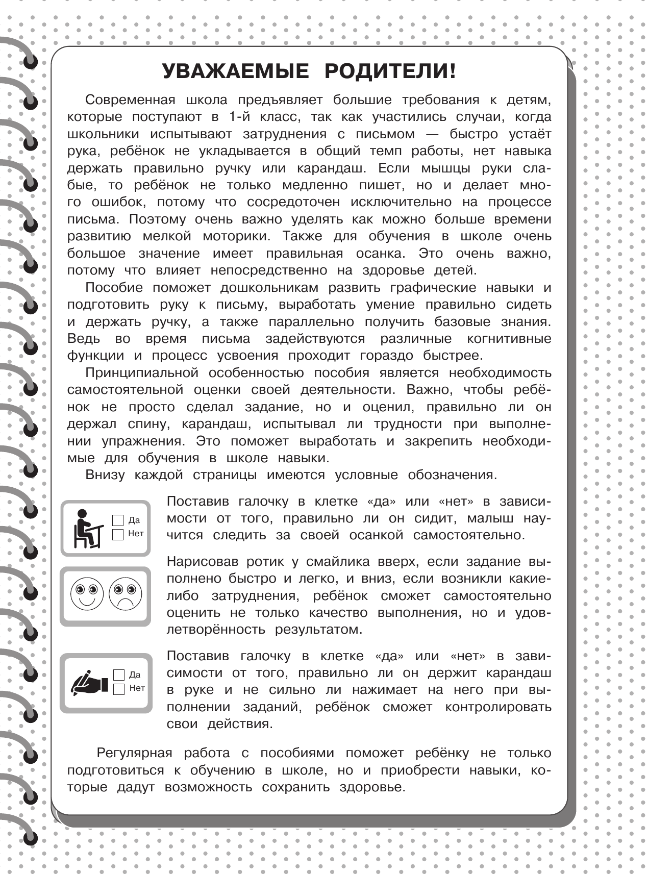 Кроме того, внизу каждой страницы имеются значки для оценки выполненных заданий. Поставив галочку в клетках "да" или "нет", малыш сможет проконтролировать себя, а нарисовав ротик у смайлика вверх или вниз - оценить результат (хорошо / не очень хорошо). Регулярная работа с пособием поможет ребёнку развить мелкую моторику.