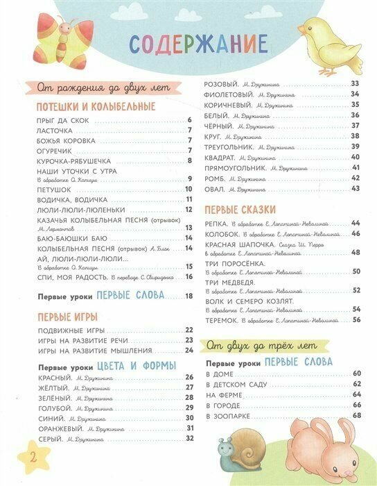 Эта книга точно станет НАСТОЛЬНОЙ и ЛЮБИМОЙ книгой каждого малыша на несколько лет. В ней собраны известные стихи, рассказы, загадки, сказки, потешки и колыбельные. Но самое главное – это алфавит и первые слова, легкие уроки по изучению цветов, цифр, форм и времени года! Удобно, что книгу разделили на разный возраст (от рождения до двух лет и от двух до трех лет). Приятный бонус – это первые игры на улице и дома. Кажется, что в книге собраны все то, что нужно и хочется читать ребенку.