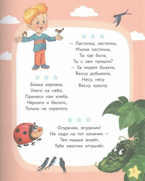 Книгой можно пользоваться с самого рождения до пятилетнего возраста ребенка. Для самых маленьких – потешки, колыбельные, картинки с первыми словами. Плюс приведены игры для всестороннего развития – на мышление, речь, физическую активность. Ребятам постарше – сказки, времена года, стихи про алфавит, счет, цвета и формы, животных. Досуговый элемент – разгадывание загадок. Милые иллюстрации. Среди авторов стихов наши любимые и все еще непревзойденные Барто, Чуковский, Саша Черный. 14 классических сказок – те, что нужно знать каждому ребенку. Словом, многофункциональное издание.