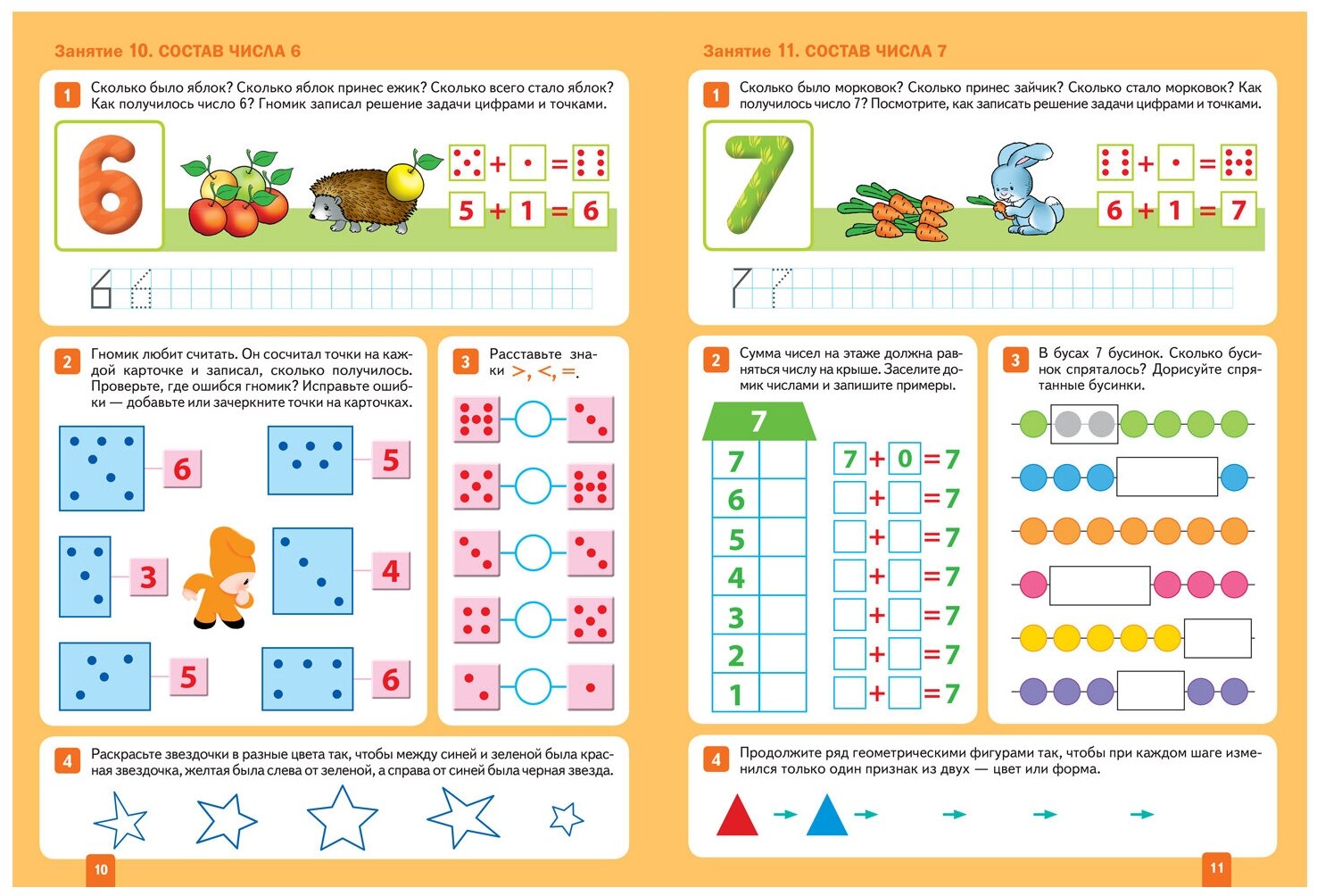 Выполняя занимательные упражнения и задания, предложенные в тетради, дети сформируют знания цифр от нуля до девяти и состава числа из отдельных единиц цифрами, познакомятся с понятиями количества и порядкового счета предметов в пределах числового ряда первого десятка. Научатся видеть относительные числовые связи (больше, меньше, равно), решать простые примеры и задачи на сложение и вычитание, сформируют навыки ориентирования в пространстве и во времени. Усовершенствуют навыки работы со схемами и решения логических задач, формируя умения анализировать, обобщать, сравнивать, рассуждать, делать умозаключения и выводы.