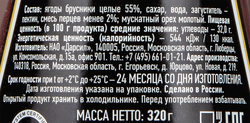 | Состав | Ягоды брусники целые 55%,сахар, вода, загуститель- пектин, смесь перцев менее 2%, мускатный орех молотый. |