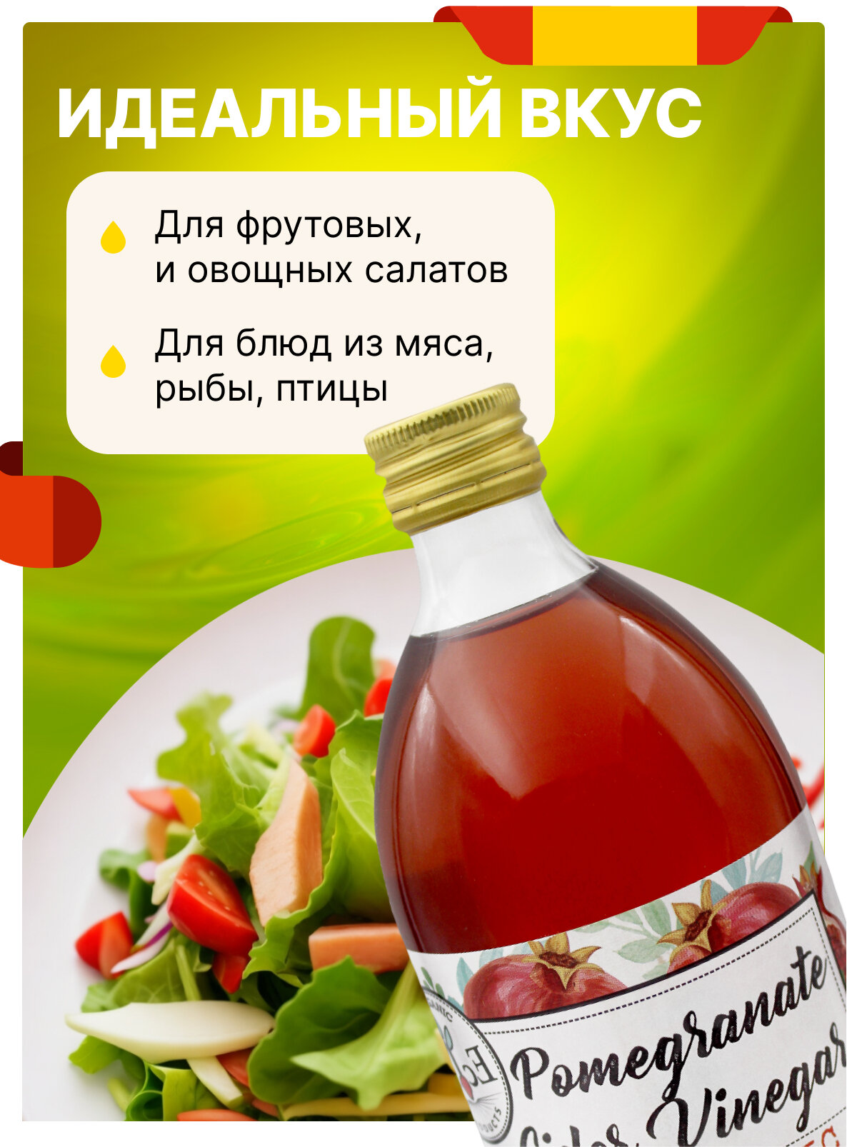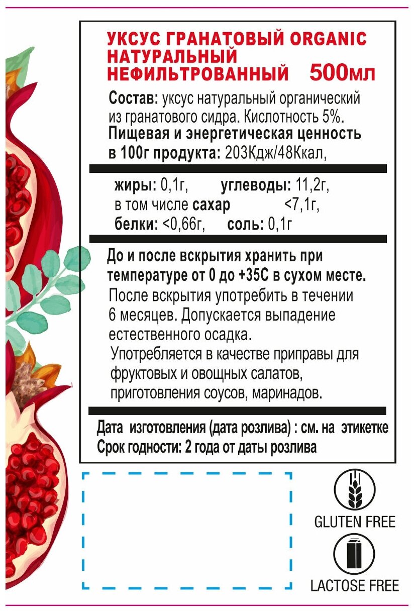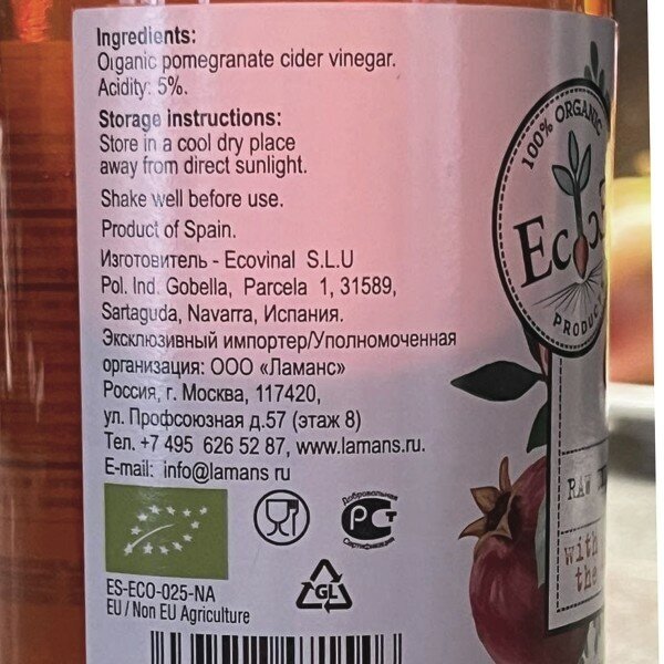 Натуральный нефильтрованный гранатовый уксус Ecoce Organic упакован в прозрачную бутылку с крышкой и имеет объем 500 мл. Продукт за счет своего сладковато-терпкого вкуса применяется в разных кухнях мира в качестве заправки для салатов, как компонент маринада или рассола для консервации. За счет отсутствия этапа фильтрации уксус можно отнести к крафтовым продуктам. Процесс сбраживания проходит естественным путем.
