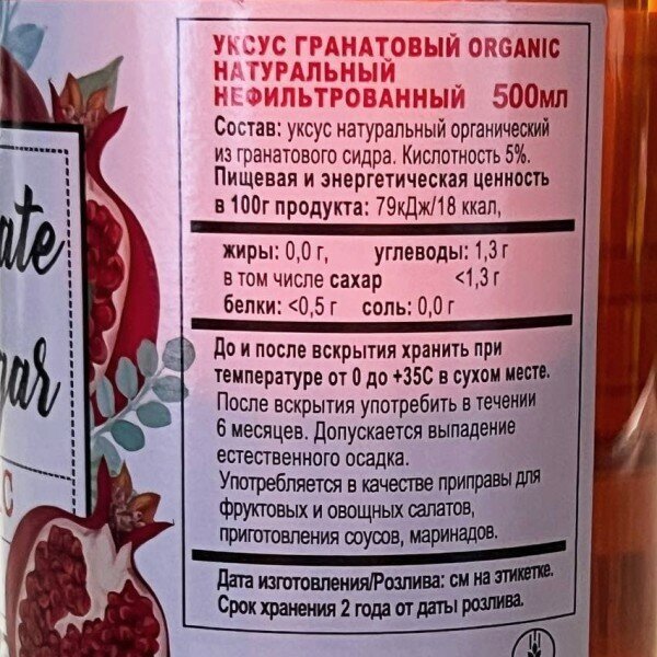 Уксус имеет темно-красный цвет, так как для его производства используется натуральный гранатовый сок. Это позволяет сохранить все витамины и питательные вещества фрукта. Среди особенностей приготовления можно выделить следующее: