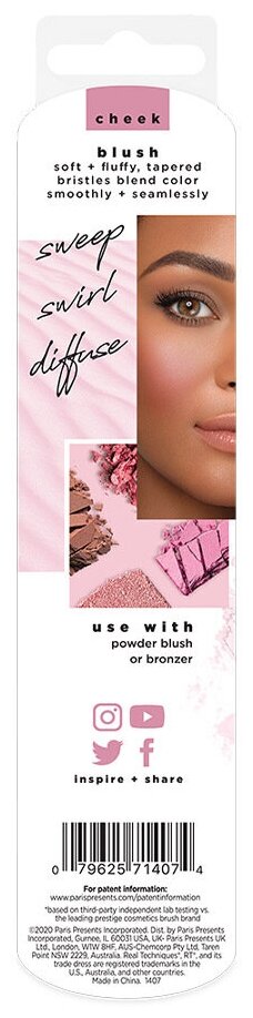 С помощью BlushBrush можно наносить также бронзер, пудру или хайлайтер. Кисть отлично набирает, растушевывает, смешивает и легко наслаивает любые сухие текстуры, не позволяя им оставлять пятен, разводов и резких границ. Легко моется, быстро высыхает, не линяет и сохраняет свою форму на протяжении долгого времени.
