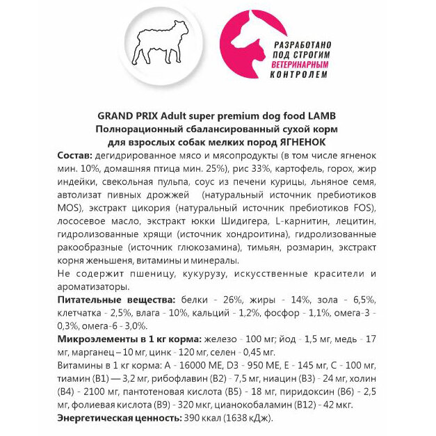 Корм GRAND PRIX Adult с ягненком и рисом для взрослых собак мелких и мини пород разработан с учетом суточных