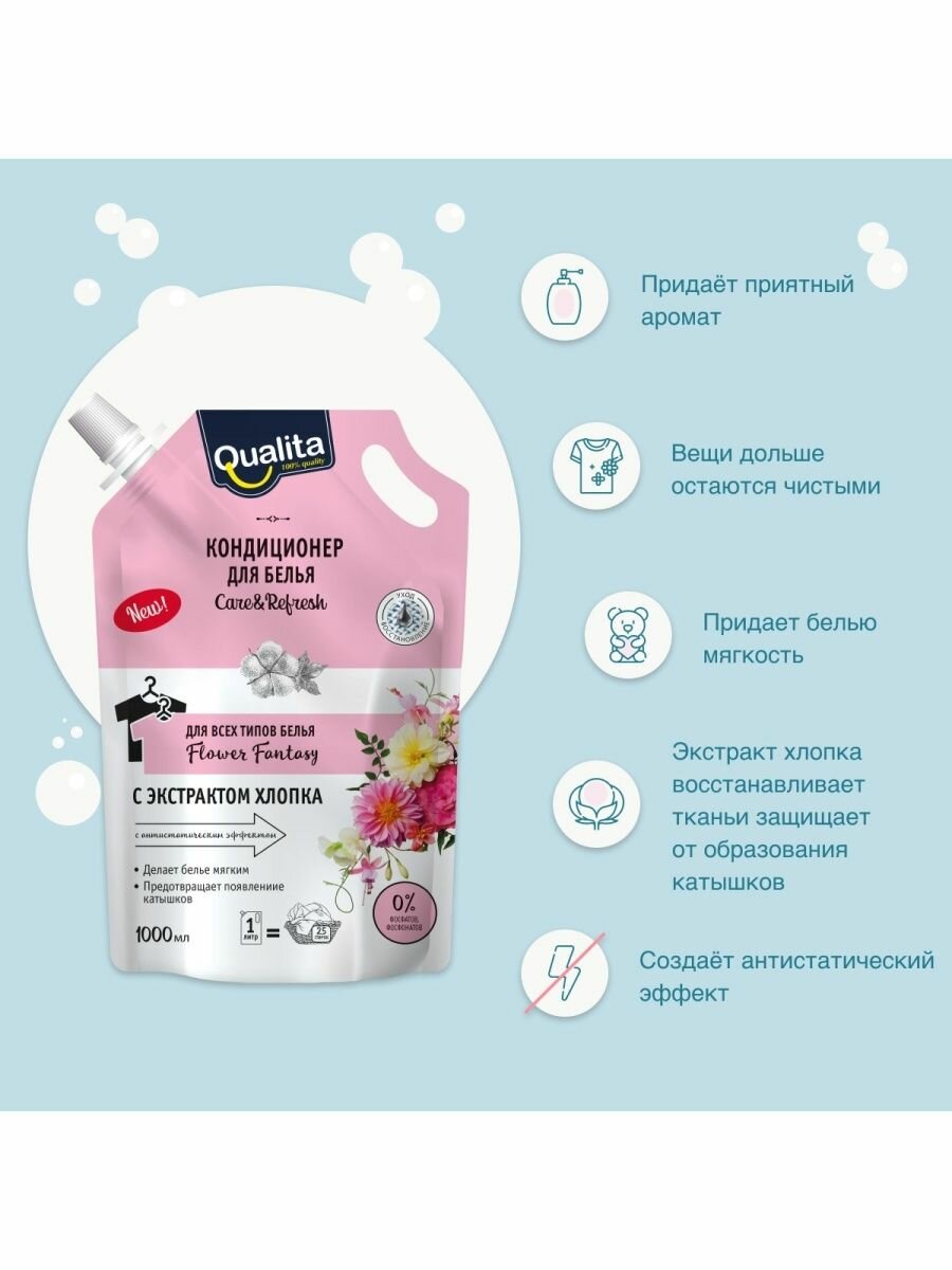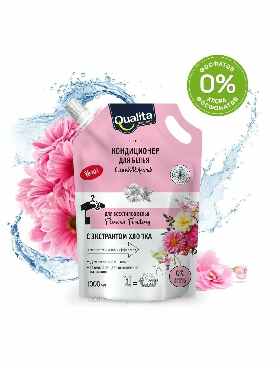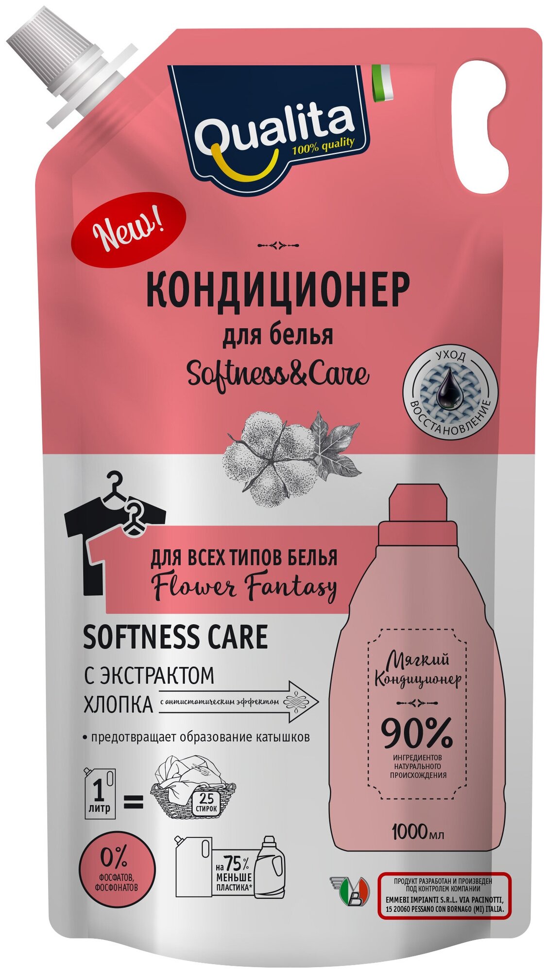 Концентрированная жидкая формула кондиционера Qualita "Flower fantasy" хорошо растворяется в воде, делая бельё мягким, шелковистым и приятным на ощупь. Кондиционер устраняет статическое электричество и облегчает глажение, придавая приятный аромат свежести. Не даёт белью пожелтеть даже при полоскании не идеальной водой. Благодаря защитному слою, который образуется на поверхности ткани после стирки с кондиционером, вещи дольше остаются чистыми. Экстракт хлопка восстанавливает ткань и защищает от образования катышков.