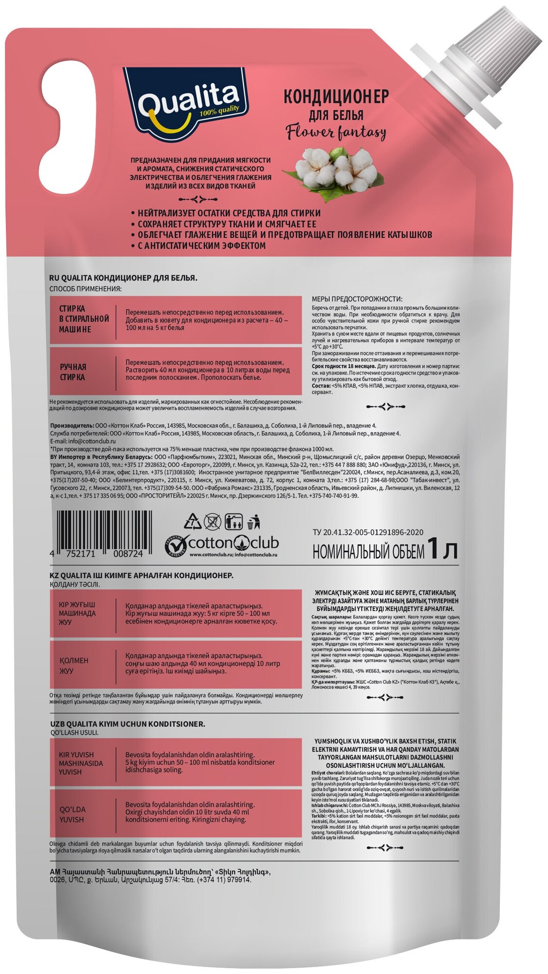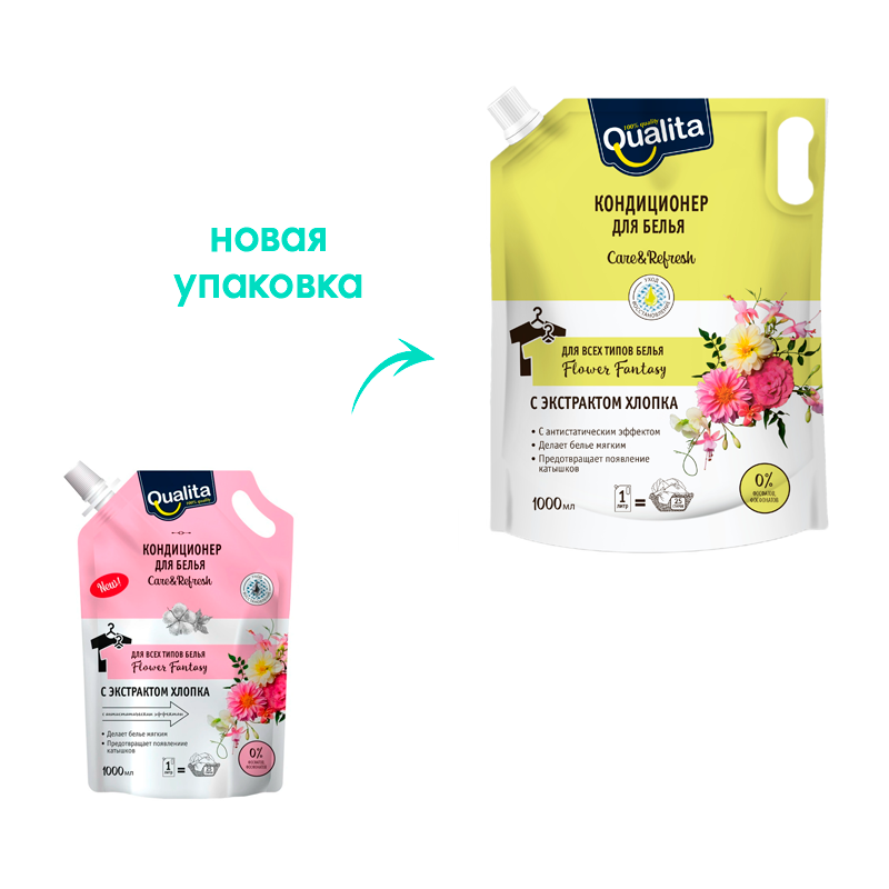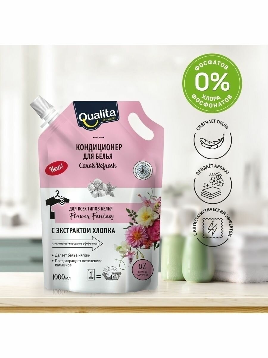 Концентрированная жидкая формула кондиционера Qualita "Flower fantasy" хорошо растворяется в воде, делая бельё мягким, шелковистым и приятным на ощупь. Кондиционер устраняет статическое электричество и облегчает глажение, придавая приятный аромат свежести. Не даёт белью пожелтеть даже при полоскании не идеальной водой. Благодаря защитному слою, который образуется на поверхности ткани после стирки с кондиционером, вещи дольше остаются чистыми. Экстракт хлопка восстанавливает ткань и защищает от образования катышков.