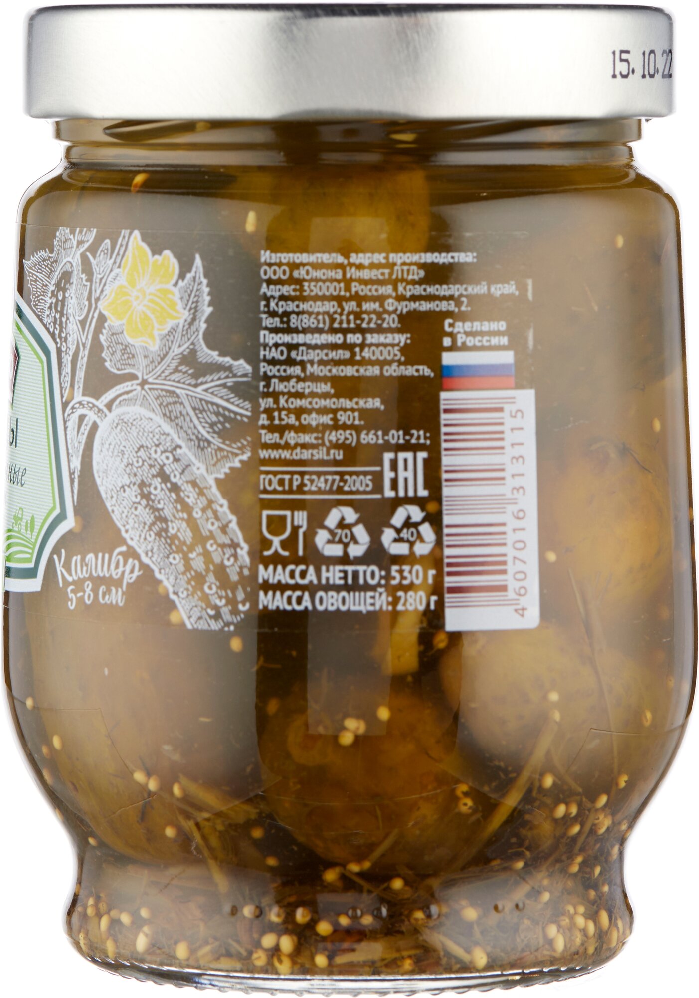 | Состав | Огурцы свежие, вода питьевая, сахар, соль, регулятор кислотности-уксусная кислота, чеснок, лук, укроп, пряности, семена горчицы. |