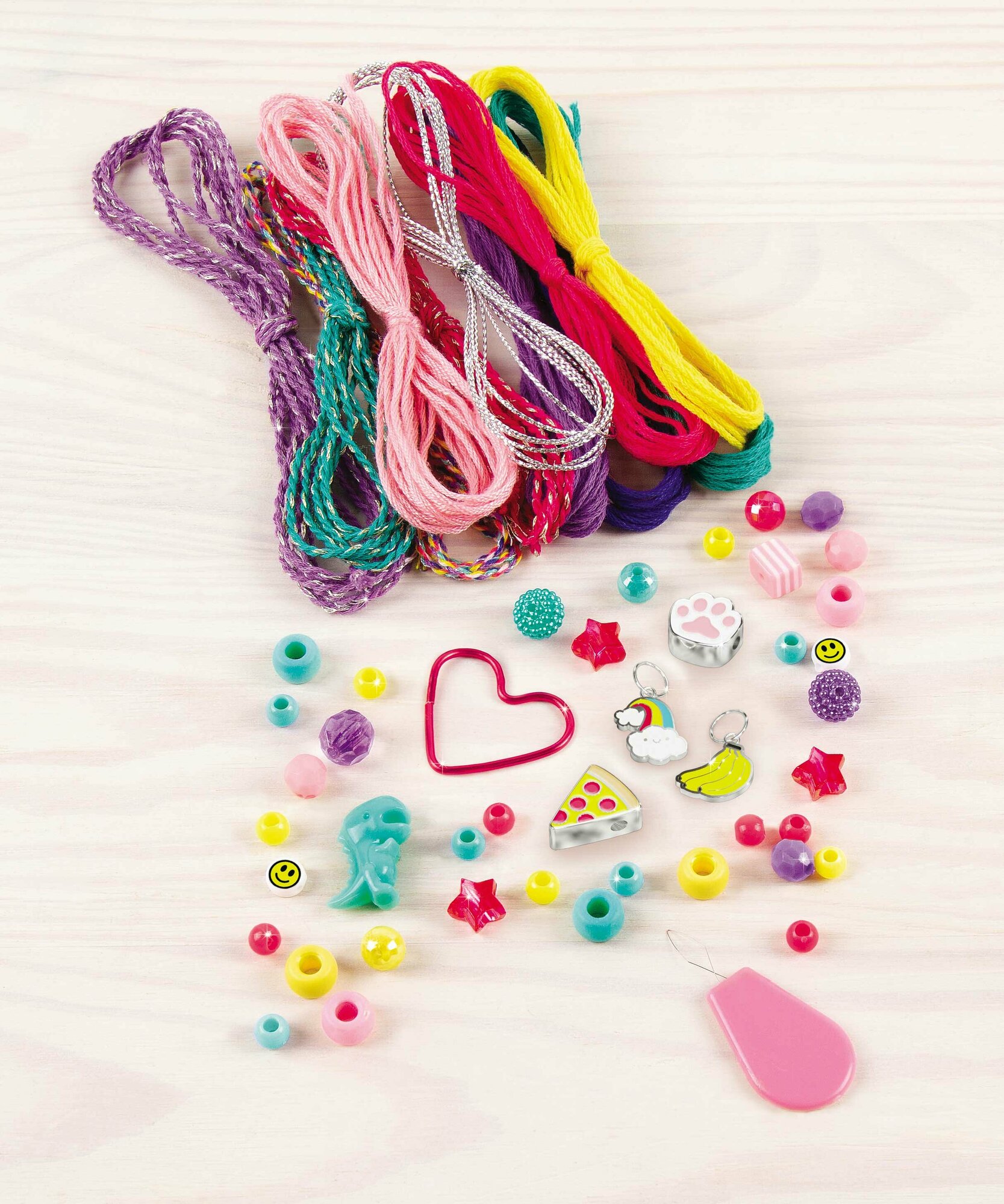 | Состав набора | блестящий шнур - 7 шт, однотонный шнур - 7 шт, бусины - 38 шт, шарм - 4 шт, колечки-сердечки - 7 шт, подставка-органайзер - 1 шт, инструкция - 1 шт |