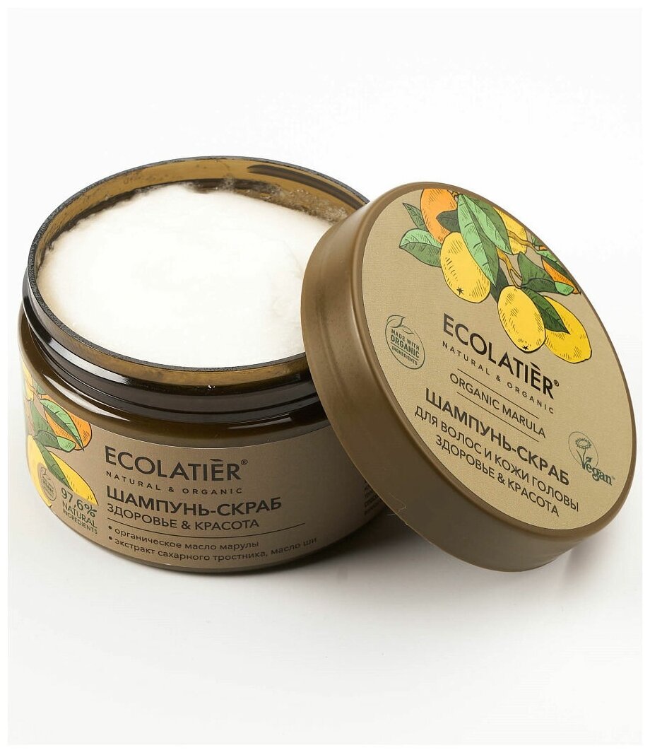 Шампунь - скраб ECOLATIER® Organic Marula, благодаря натуральным активным компонентам в составе, делает процедуру очищения кожи головы и волос нежной и приятной. Специальные скрабирующие микрочастицы обеспечивают массаж и глубокое очищение кожи от лишнего себума и средств для укладки, активизируют кровообращение и клеточное дыхание кожи. Соответствует требованиям Vegan Society (Великобритания). Продукт содержит более 97% ингредиентов растительного происхождения.