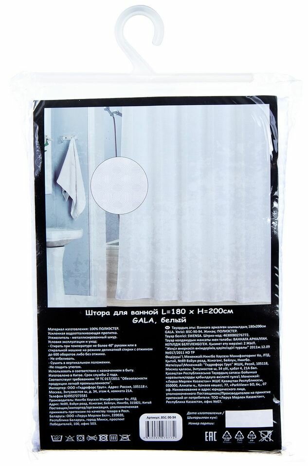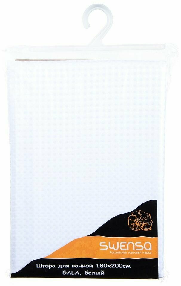 **Штора для ванны Swensa Gala** предотвращает разбрызгивание воды на пол ванной комнаты, мебель. Изготовлена из полиэстера. Имеет водоотталкивающую обработку. Цвет — белый. Не регулируется по ширине. Крепится к штанге на кольца (не входят в комплект поставки). Для них предусмотрено 12 отверстий с металлическими ушками. Для ухода применяется ручная стирка.