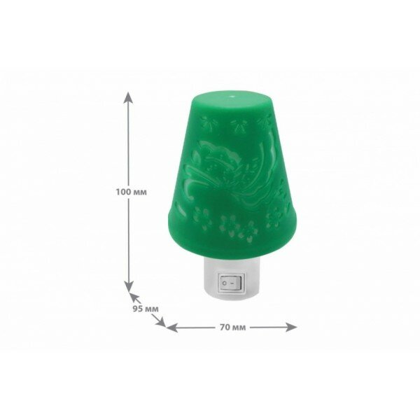 Детский ночник на розетку “Зеленый”. Camelion NL-194 - ночник из 3х светодиодов суммарной мощностью 0.5 Вт в виде лампы с зеленым абажуром. Поможет малышу спокойно заснуть, не боясь темноты и “всяких-разных”, спрятавшихся под кроватью. Вреда никакого не окажет, но убережет малыша от детских страхов. Особенно полезен будет детям, которые просыпаются ночью по самым разным причинам: попить, сходить в туалет, перебраться к родителям - путь в нужном направлении будет подсвечен, а значит безопасен. Родителям также будет очень полезен, особенно тем, кто будет наблюдать за малышом в первые месяцы его жизни. Мягкий приглушенный свет абсолютно не мешает спать, а возможную помощь трудно переоценить. На корпусе имеется выключатель, ночник можно отключить не вынимая из розетки. Основные характеристики:▪ Мощность (Вт) - 0.5▪ Источник света - светодиоды▪ Количество светодиодов (шт) - 3▪ Напряжение питания (В) - 220▪ Провода нет, крепится на розетку▪ Размер мм (ШхГхВ) - 100х70x95▪ Выключатель на корпусе - есть▪ Материал - пластик▪ Гарантия (мес) - 12