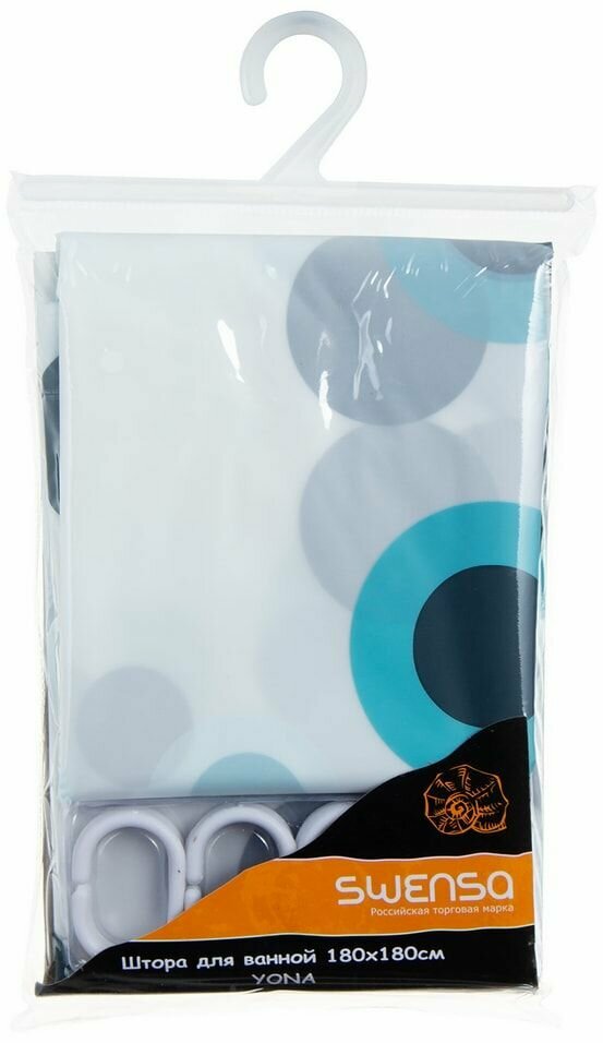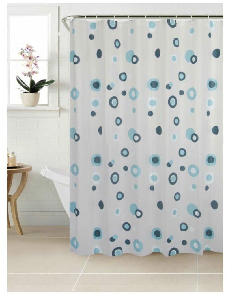 Штора для ванной комнаты это необходимый атрибут интерьера, защищающий помещение от брызг воды и мыльной пены. Штора укомплектована пластмассовыми кольцами (12 колец в комплекте) для фиксации изделия на штанге. Материал: пева (полиэтиленвинилацетат) содержат в 10 раз меньше вредных веществ чем ПВХ. Шторы из этих материалов прочные, эластичные, мягкие и приятные на ощупь, быстро высыхают. Материал PEVA — совершенно нетоксичный полимерный материал.