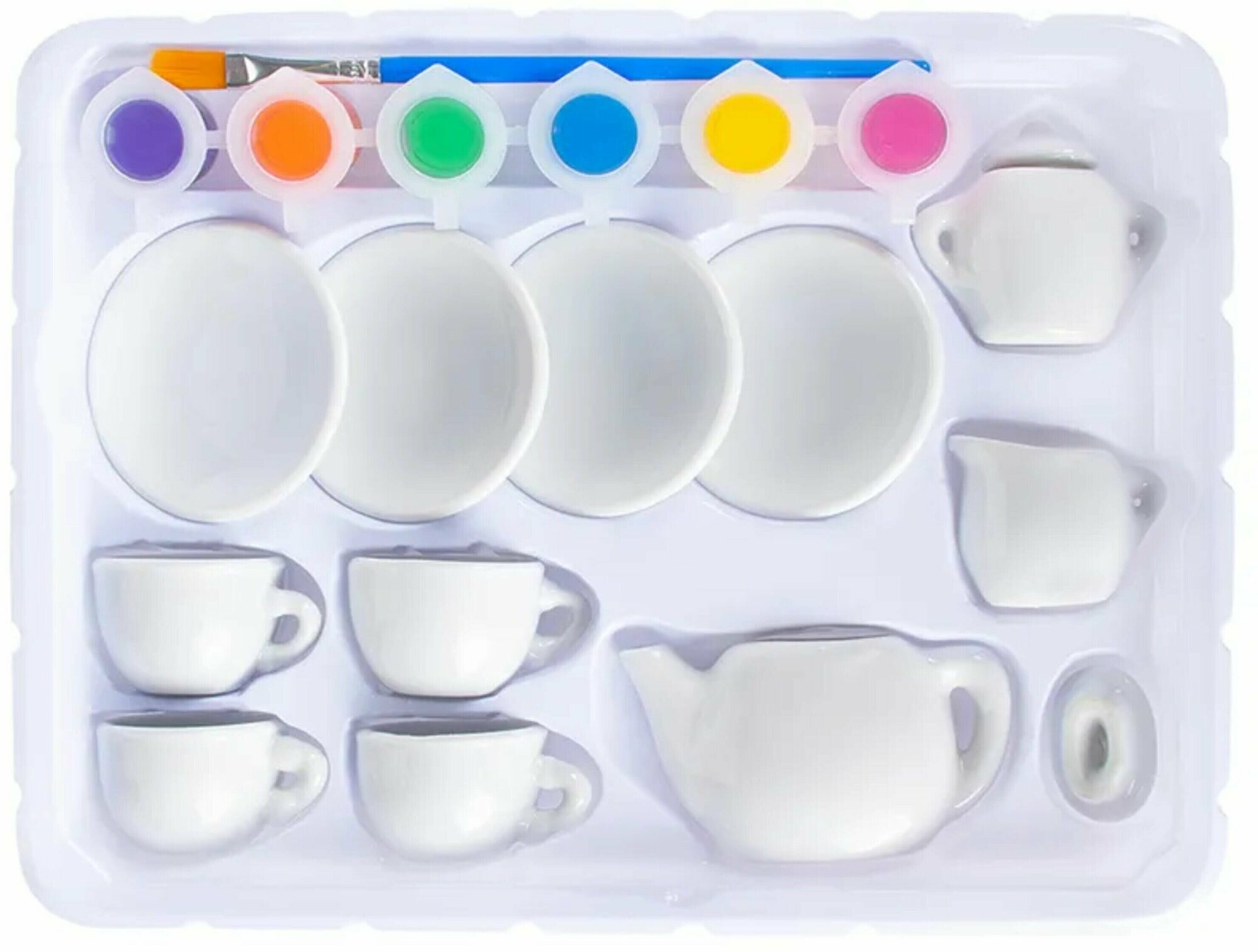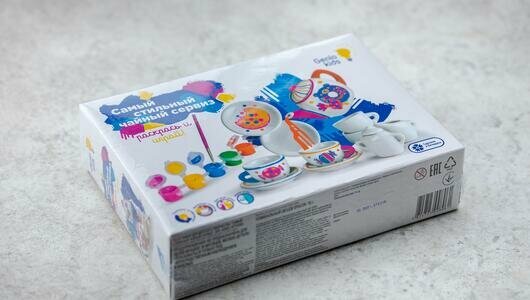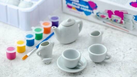 Состав: Набор для детского творчества, в состав которого входят чайник, сахарница, молочник, чашки, тарелки, краски и кисть.