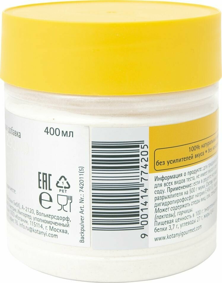 Разрыхлитель теста подходит для всех видов теста. Он не имеет вкуса и легко смешивается. Ваше тесто получится объемным и пышным. Применение: отлично подходит для всех видов выпечки.