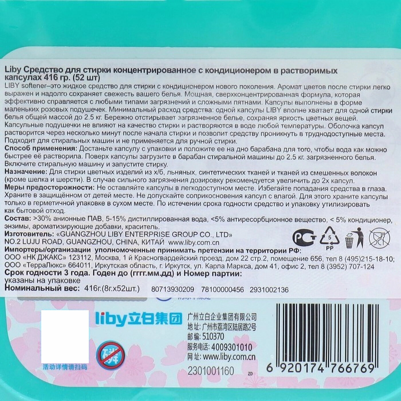 Гель-капсулы для ежедневной стирки 3в1 Liby "Softener" с кондиционером - это жидкое гель средство для стирки белого и цветного белья нового поколения. Капсулы для стирки Liby помогают сохранить и насытить цвет белья. Все средства для стирки белья Liby имеют ЭКОлогически подтвержденный состав и не наносят вреда окружающей среде. Все, что нужно для стирки, в одной капсуле! Благодаря суперконцентрированному составу для регулярной стирки белья общей массой 3 кг достаточно одной капсулы. Мощная, сверхконцентрированная формула, которая эффективно справляется с любыми типами загрязнений и сложными пятнами. Специальный компонент смягчает волокна ткани и защищает их от деформации. Дополнительный кондиционер не нужен. Капсулы выполнены в форме маленьких подушечек. Аромат после стирки легко выражен и надолго сохраняет свежесть вашего белья. Гель для стирки белого и цветного белья бережно отстирывает загрязненное белье, сохраняя яркость цветных вещей. Инновационная оболочка капсул полностью растворится через 2-3 минуты после начала стирки благодаря чему идеально подходят для быстрой экспресс стирки. Подходят для стиральных машин и не применяется для ручной стирки. Могут применятся на даче, не нанося вреда септикам.