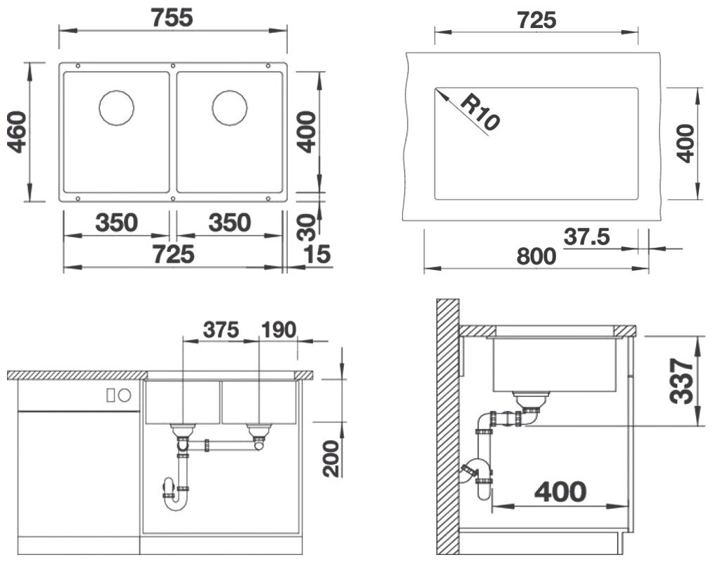Кухонная мойка SILGRANIT® PuraDur® в шкаф 80см, габарит 755x460мм, отводная арматура InFino® с двумя корзинчатыми вентилями 3 ½“, набор крепежа (уплотнитель в набор не входит).