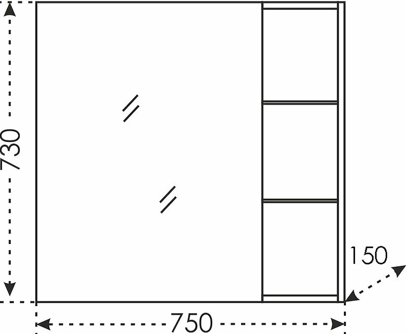 - Система хранения: зеркальная дверка, за ней две стеклянный полочки, две открытые полки сбоку.