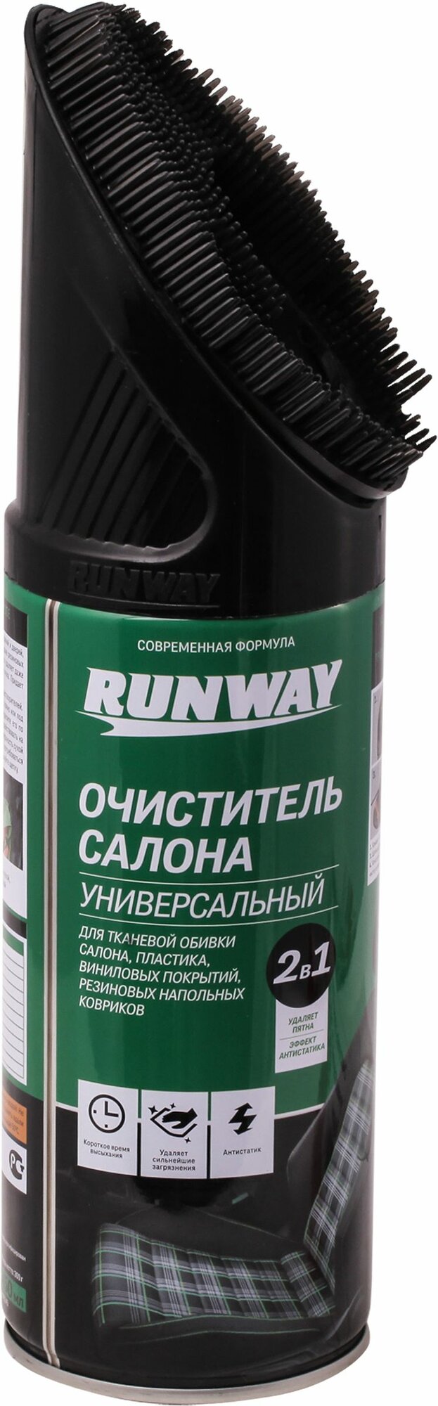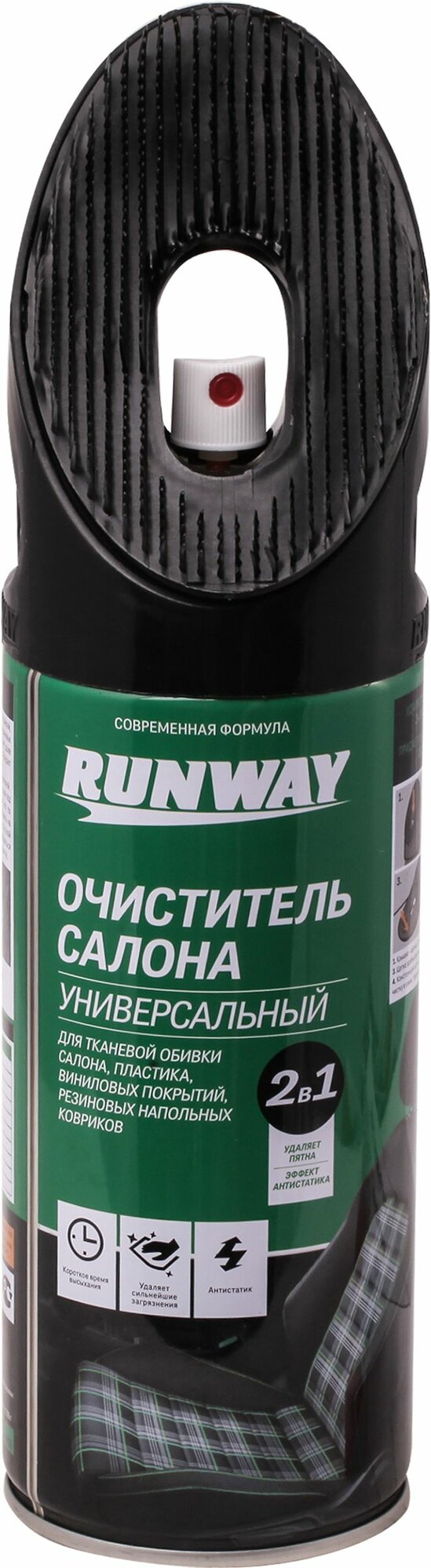 Универсальный очиститель салона RUNWAY применяется для ткани, обивки сидений и дверей, ремней безопасности, виниловых покрытий, панелей приборов, молдингов и даже резиновых и тканевых напольных ковриков. Благодаря компоненту - активная пена - легко удаляет даже застарелую грязь с обивки салона и пластиковых деталей дверей, потолка и люка. Придает материалам антистатические свойства.