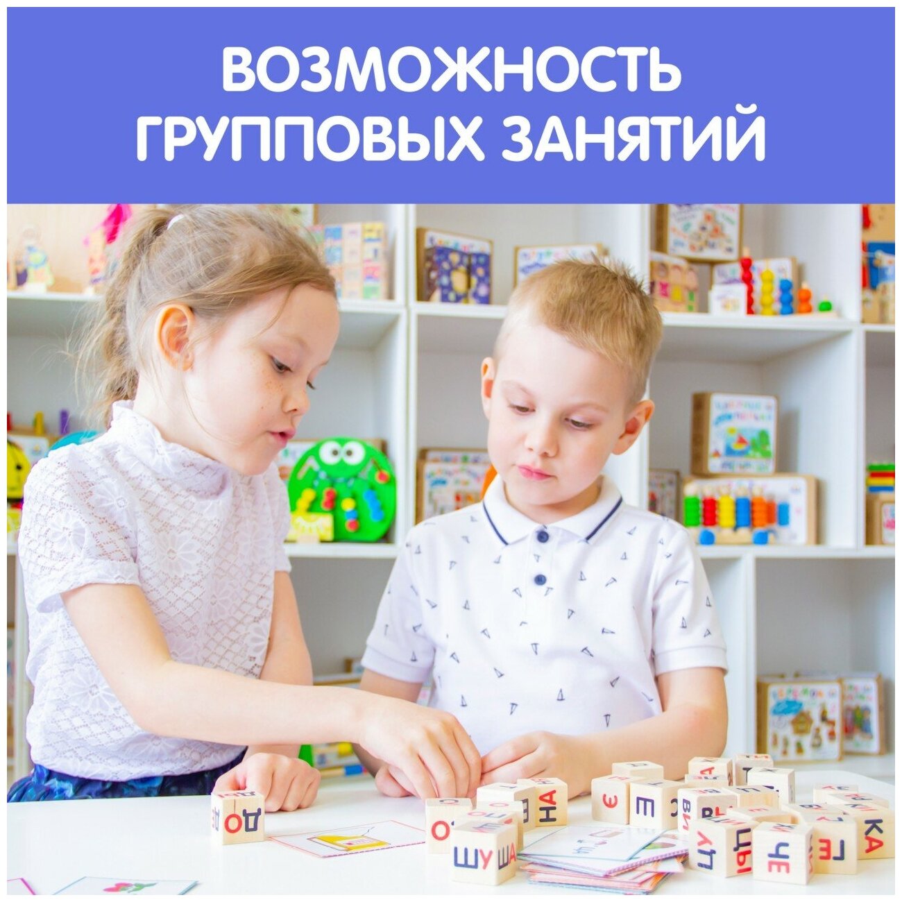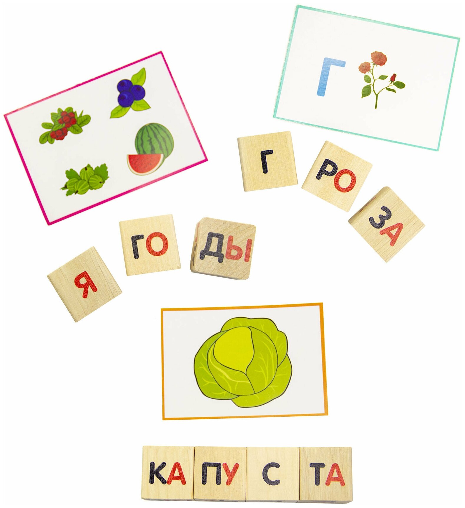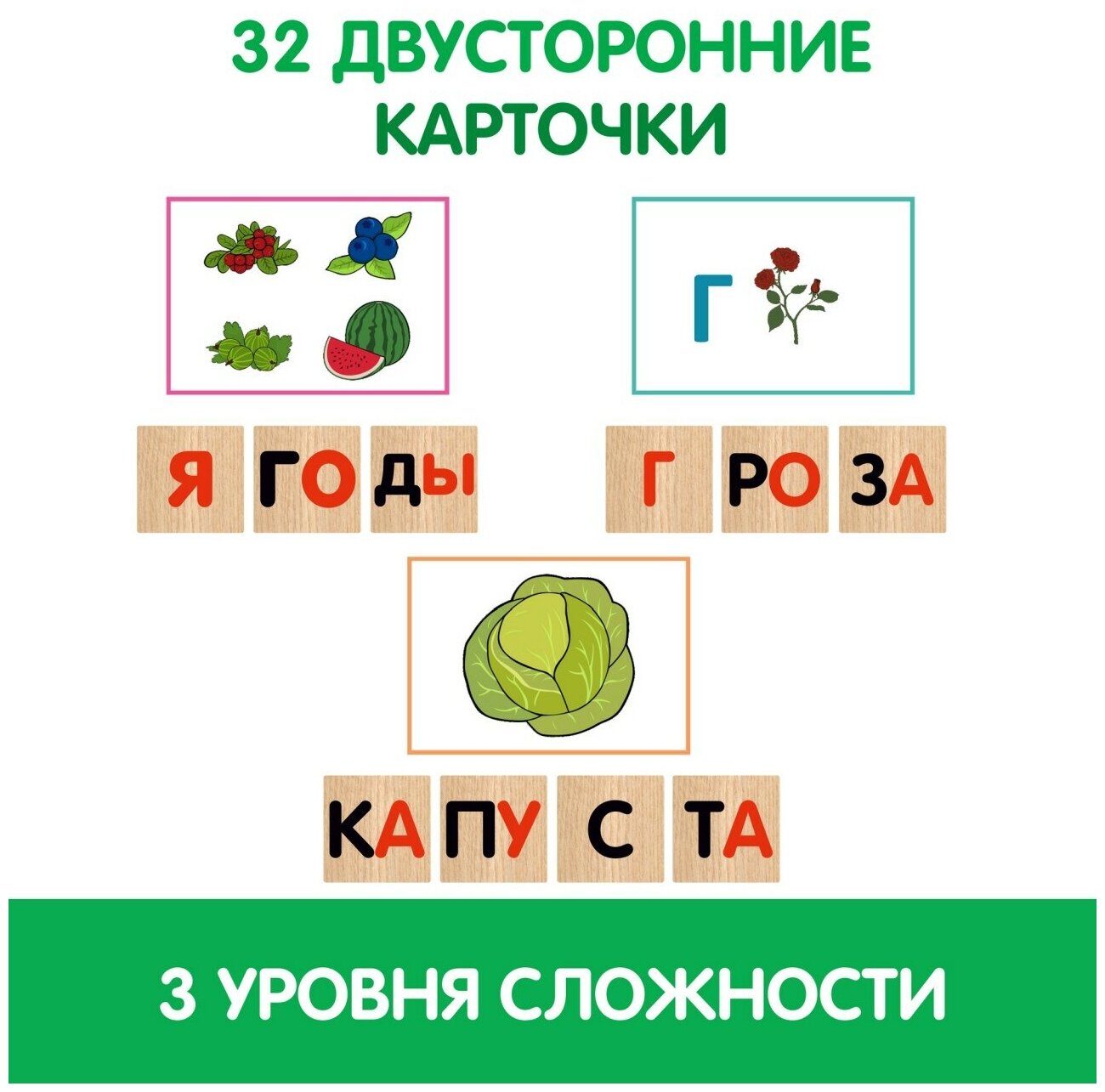 | Комплектация | 25 кубиков с буквами и слогами; 32 двусторонние карточки с заданиями |