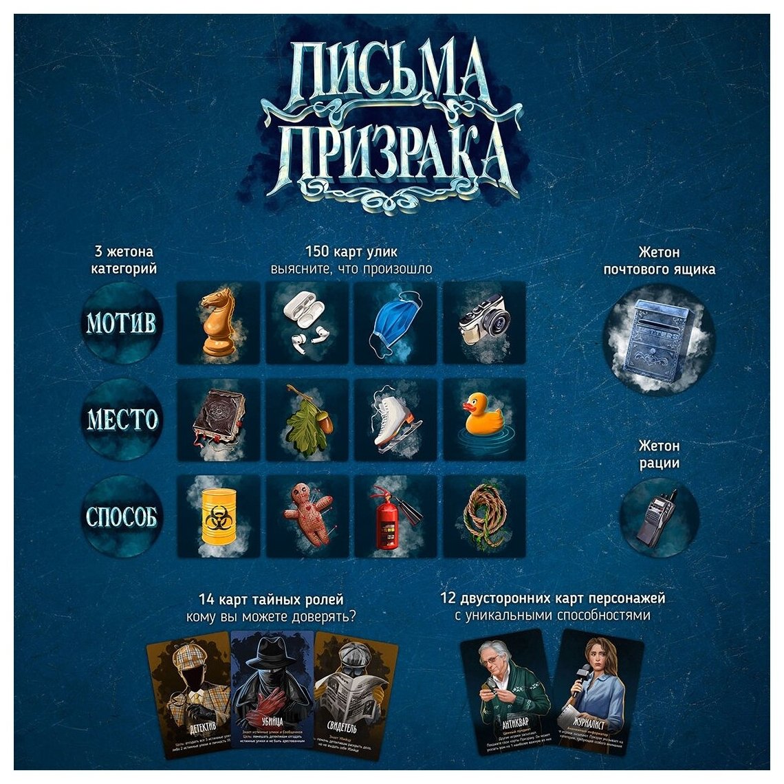 Детектив «Письма призрака» — игра с тайными ролями о расследовании преступления. Игроки-детективы из 12 улик (изображений предметов), обнаруженных на месте преступления, вычисляют 3 истинные улики.