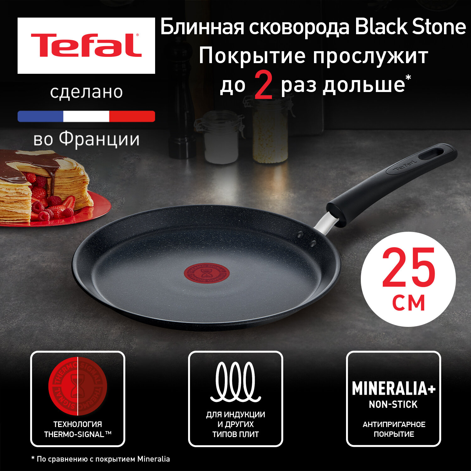 Сила природы на вашей кухне Посуда Tefal Black Stone Black Stone G2813872 сочетает в себе безупречное качество и долгий срок службы. Сковорода для блинов имеет ультрапрочное антипригарное покрытие Mineralia+, которое усилено натуральными минералами и показывает исключительные антипригарные свойства даже спустя время. Испеките золотистые тонкие блинчики или воздушные и нежные оладьи и угостите ими ваших близких. Интенсивное перемешивание, приготовление на сильном огне, мытье жесткой щеткой… Современные кулинарные проблемы требуют современных решений – посуду, которая выдерживает проверку временем. Мы в Tefal верим в силу натуральных минералов, поэтому мы применили весь наш опыт, чтобы усовершенствовать антипригарное покрытие Mineralia+ для серии посуды Black Stone. Мы усилили покрытие ультрапрочными минералами и придумали новую, уникальную конструкцию посуды, благодаря чему она выдерживает интенсивное обращение. Сковорода для блинов Black Stone предназначена для приготовления любимых традиционных блинчиков и осваивания новых рецептов, например, блины из батата с рикоттой, блины без глютена, сладкие и соленые блинчики и другие. Индикатор Thermo-Signal показывает, когда сковорода нагрелась до идеальной температуры и можно начинать готовить, а дно Thermo-Fusion обеспечивает равномерный нагрев посуды для идеальных результатов. Все, что мы производим в Tefal уже более 60 лет, мы производим с заботой. С самого начала мы стремимся внедрять инновации и создавать полностью безопасные и максимально эффективные продукты, которые не вредят окружающей среде. Наша продукция не содержит PFOA, кадмий и свинец и производятся с применением французской экспертизы.