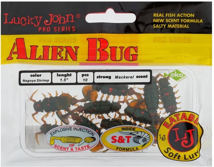 Lucky John Alien Bug 38 - необычная имитация насекомого с “пяткой” как у виброхвоста. На теле приманки имеются усики и многочисленные лапки, придающие ей больше сходства с живым жуком или личинкой.