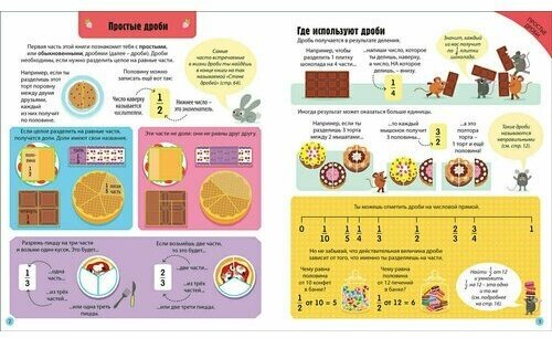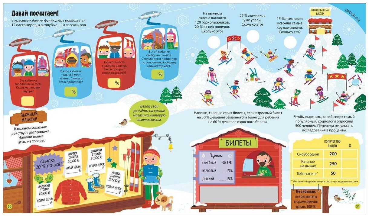 Каждый разворот - это настоящее приключение в мире дробей и процентов. Выполняй задания, раскрашивай, узнавай, разглядывай и клей наклейки!