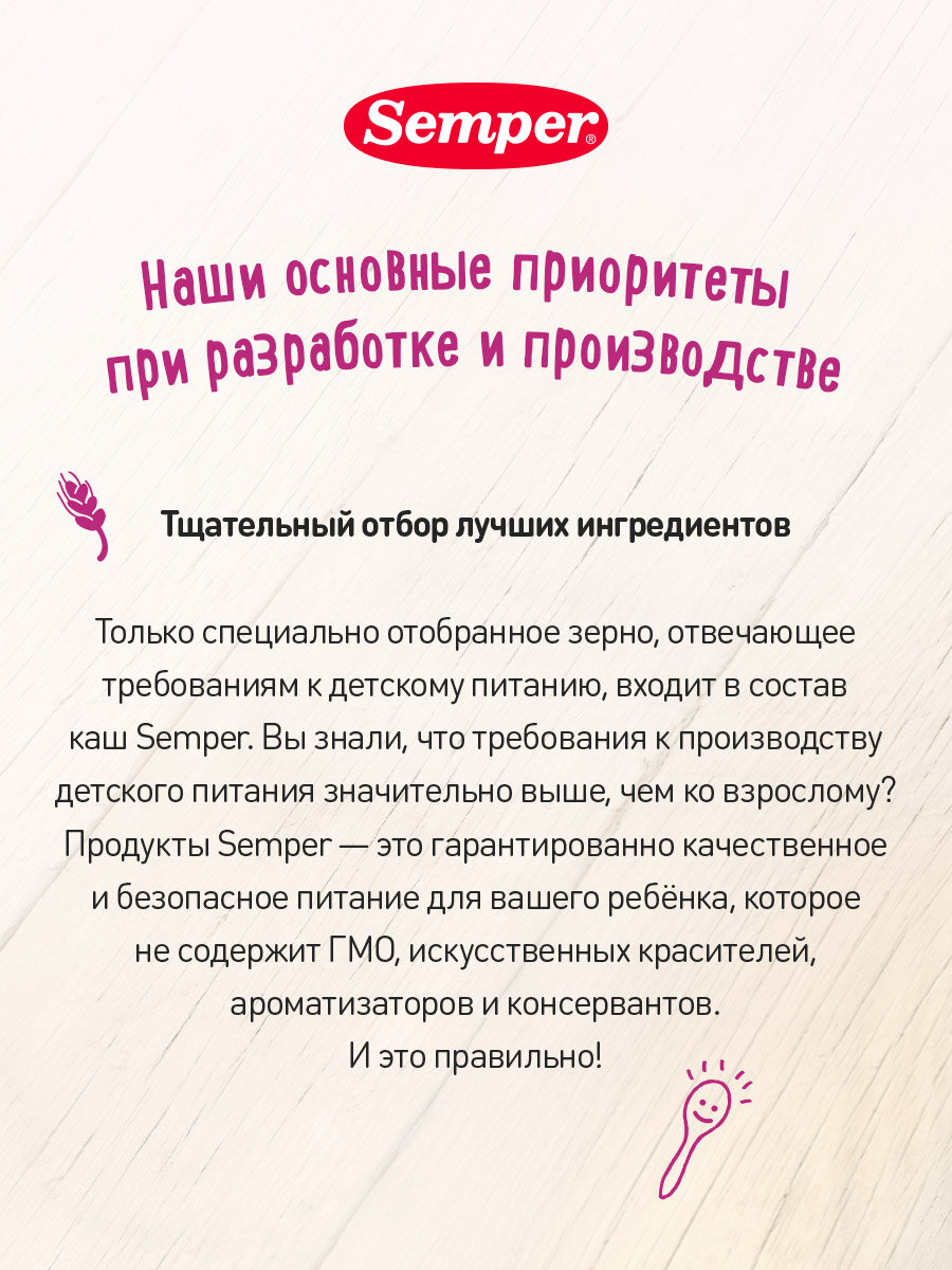 Semper - натуральное и премиальное детское питание №1 в Швеции. Мы придерживаемся шведских стандартов качества и философии экологичности, создавая вкусную еду для малышей.Гречневая безмолочная каша без добавок подойдет в качестве завтрака или основного блюда с 4 месяцев.Гречка считается низкоаллергенным (гипоаллергенным) злаком, не содержит глютен. Этот злак богат витаминами группы В и минералами.Каша детская сухая легко разводится без комочков и имеет чистый состав:без молокабез глютенабез пальмового маслабез добавления искусственных витаминовбез сахара и сахарозаменителябез мальтодекстринабез применения гидролиза (сберегаем натуральность злаков, предотвращаем образование сахаров, формируем правильные привычки)Только 100 % натуральная гречневая крупа. Идеально подходит для первого прикорма.