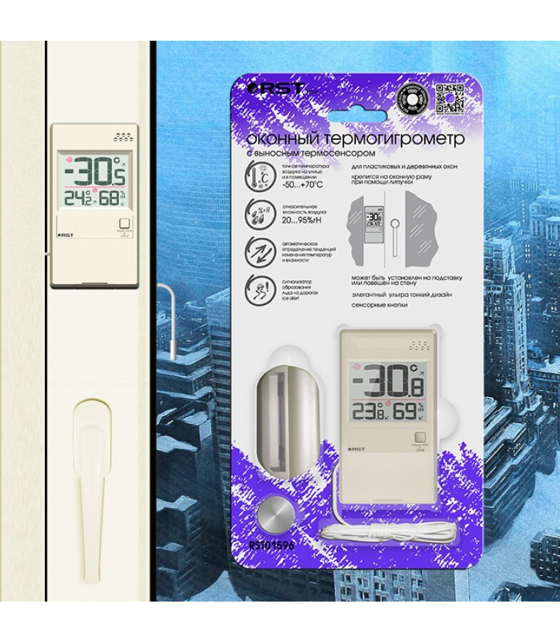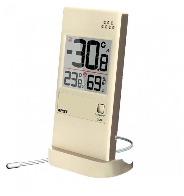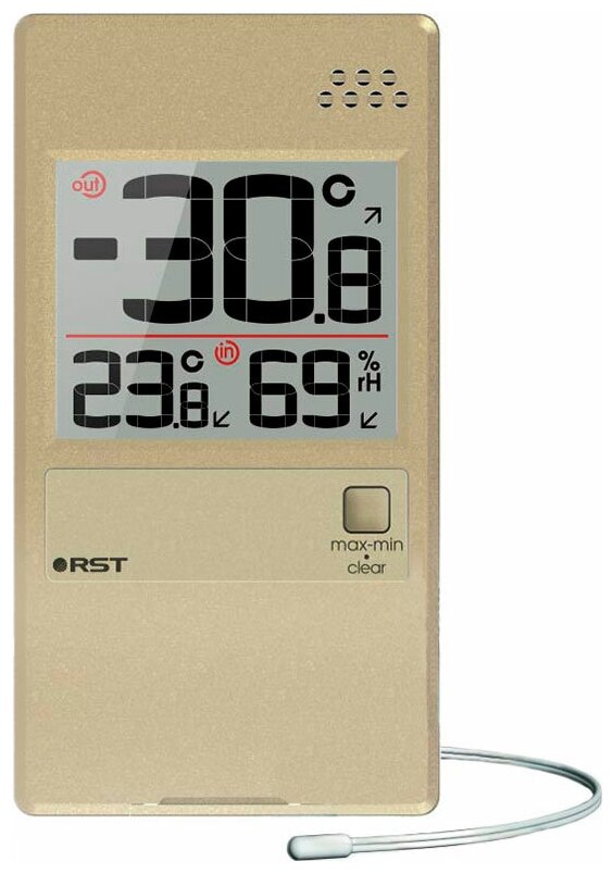 Бытовой настольный термогигрометр от Rst способен показывать уличную и комнатную температуры, анализируя их и прогнозируя тенденции изменений. Устройство также замеряет показатель относительного уровня влажности. Корпус модели ультратонкий (7 миллиметров) и представлен в цвете шампань. Термогигрометр может крепиться к окну, а также может располагаться на стене или на любой горизонтальной поверхности на подставке. Уличные показатели фиксируются посредством выносного термосенсора.