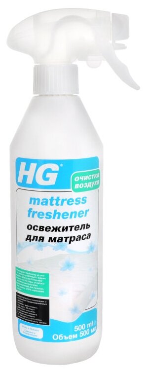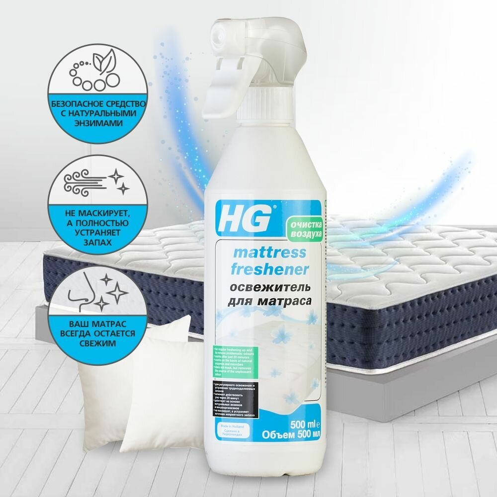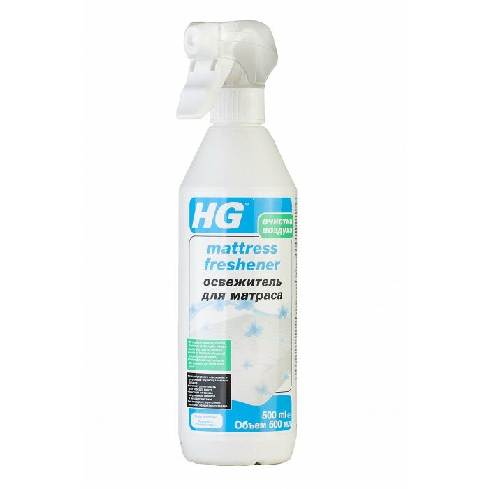 HG Освежитель для матраса 0.5 л Со временем матрасы могут утрачивать запах свежести. HG освежитель для матраса был разработан специально для регулярного, удобного и безопасного освежения матрасов. Это предотвращает появление неприятных запахов, вызванных естественным потоотделением в ночное время, поэтому матрас остается свежим и приятно пахнет. Продукт действует на основе натуральных энзимов и микроорганизмов, а значит, запахи не маскируются, а эффективно устраняются. Инновационные формулы продуктов для ухода за домом и приусадебным участком HG разработаны по принципу «для каждой проблемы – свое решение». Для любого загрязнения и пятна существует средство HG, которое способно справиться с ними быстро и без усилий! Состав моющих средств безопасен для использования в детских комнатах, в домах, где живут аллергики, а также домашние животные. Экологичные средства лидера европейского рынка DIY и B2B – залог вашего здоровья и долголетия!